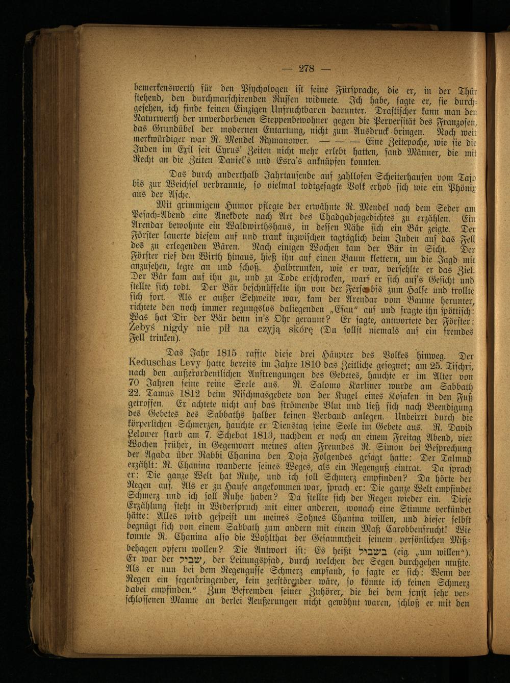 Das Jahr 1815 raffte diese drei Häupter des Volkes hinweg. Der X6ciu8oliu8 lwv.p hatte bereits im Jahre 1810 das Zeitliche gesegnet; ani 25. Tischri, nach den außerordentlichen Anstrengungen des Gebetes, hauchte er im Alter von 70 Jahren seine reine Seele aus. R. Salomo Karliner wurde am Sabbath 22. Tamus 1812 beim Nischmasgebete von der Kugel eines Kosaken in den Fuß getroffen. Er achtete nicht ans das strömende Blut und ließ sich nach Beendigung des Gebetes des Sabbaths halber keinen Verband cmlegen. Unbeirrt durch die körperlichen Schmerzen, hauchte er Dienstag seine Seele im Gebete aus. R. David Alower starb am 7. Schebat 1813, nachdem er noch an einem Freitag Abend, vier Wochen früher, in Gegenwart meines alten Freundes R. Simon bei Besprechung der Agada über Rabbi Chanina ben Dosa Folgendes gesagt hatte: Der Talmud erzählt: R. Chanina wanderw seines Weges, als ein Regenguß eintrat. Da sprach er: Die ganze Welt hat Ruhe, und ich soll Schmerz empfinden? Da hörte der Regen aus. Als er zu Hause angekommen war, sprach er: Die ganze Welt empfindet Schmerz und ich soll Ruhe haben? Da stellte sich der Regen wieder ein. Diese Erzählung steht in Widerspruch mit einer anderen, wonach eine Stimme verkündet hätte: Alles wird gespeist um meines Sohnes Chanina willen, und dieser selbst begnügt sich von einem Sabbath zum andern mit einem Maß Carobbenfrucht! Wie konnte R. Chanina also die Wohlthat der Gesammtheit seinem persönlichen Mißbehagen opfern wollen? Die Antwort ist: Es heißt (eig. „um willen").