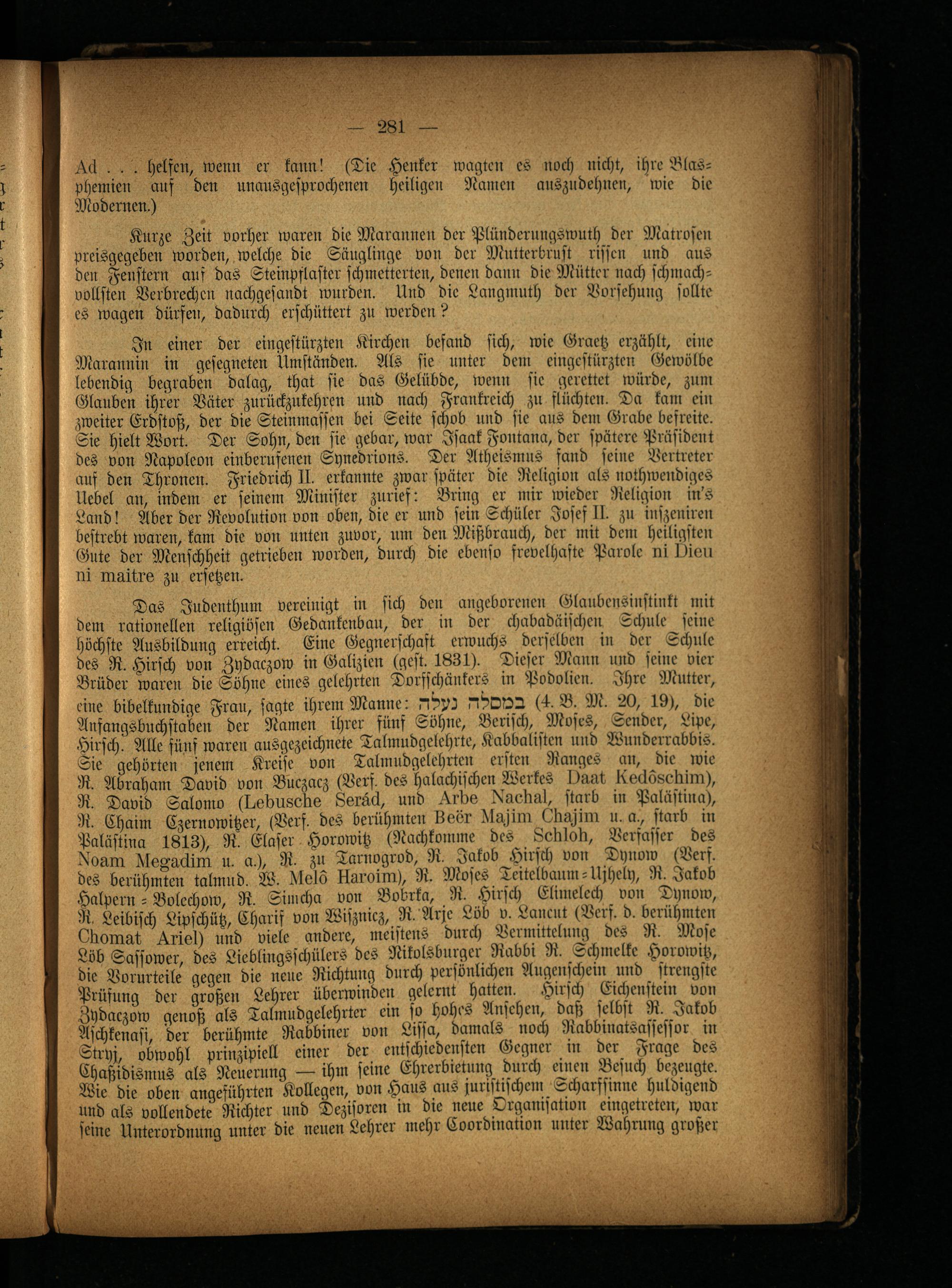 Das Judenthum vereinigt in sich den angeborenen Glaubcnsinstiiikt mit dem rationellen religiösen Gedankenbau, der in der chabadüischcn Schule seine höchste Ausbildung erreicht. Eine Gegnerschaft erwuchs derselbe» in der Schule des R. Hirsch von Zydaczow in Galizien (gest. 1831). Dieser Mann und seine vier Brüder waren die Söhne eines gelehrten Dorfschänkers in Podolien. Ihre Mutter, eine bibelkundige Frau, sagte ihrem Manne: (4. B. M. 20, 19), die