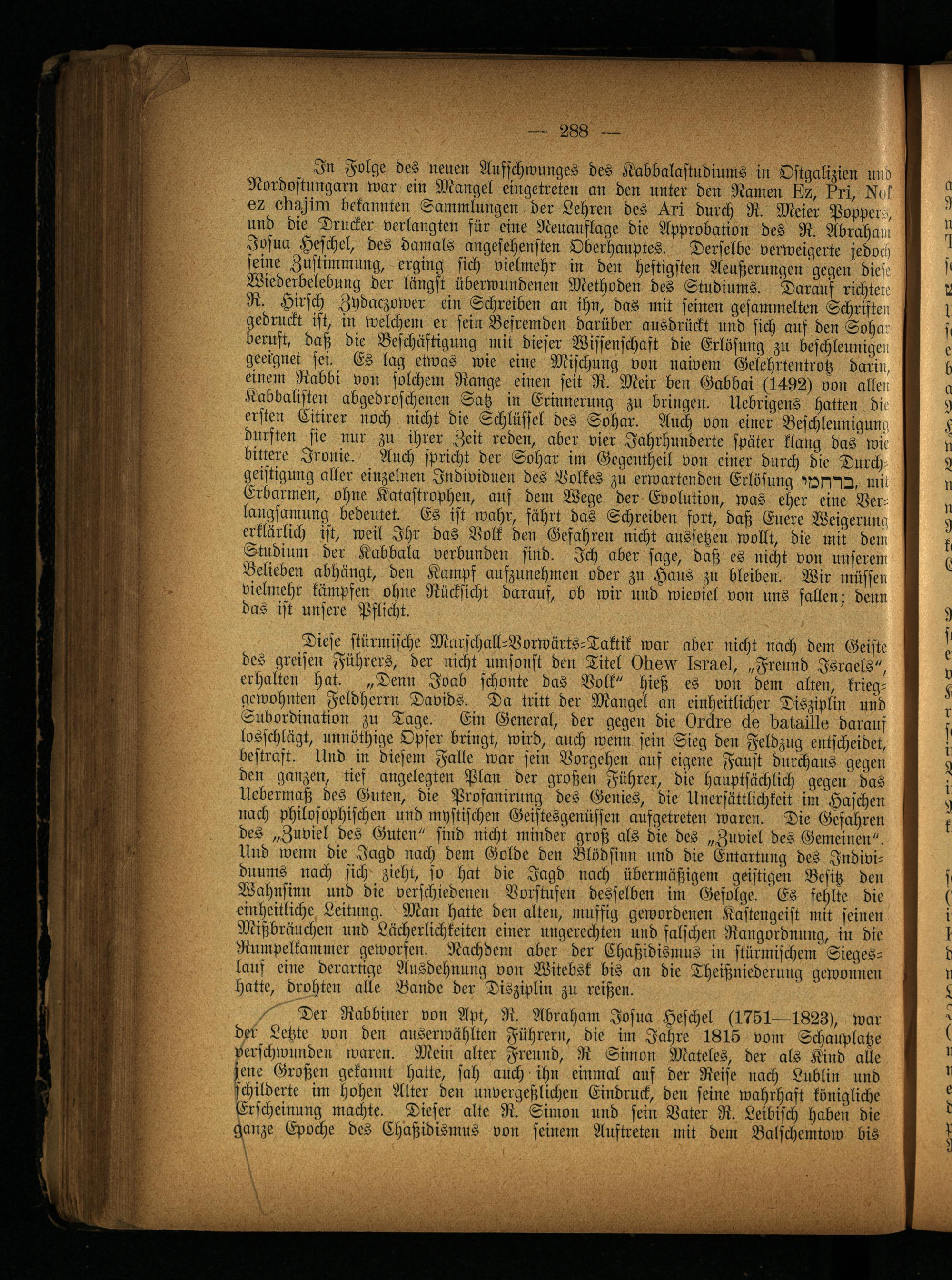 Der Rabbiner von Apt, R. Abraham Josua Heschel (1761—1823), war der- Letzte von den auserwählten Führern, die im Jahre 1816 vom Schauplatze verschwunden waren. Mein alter Freund, R Simon Mateles, der als Kind alle jene Großen gekannt hatte, sah auch ihn einmal auf der Reise nach Lublin und schilderte im hohen Alter den unvergeßlichen Eindruck, den seine wahrhaft königliche Erscheinung machte. Dieser alte R. Simon und sein Vater R. Leibisch haben die chanze Epoche des Chaßidismus von seinem Auftreten mit dem Balschemtow bis