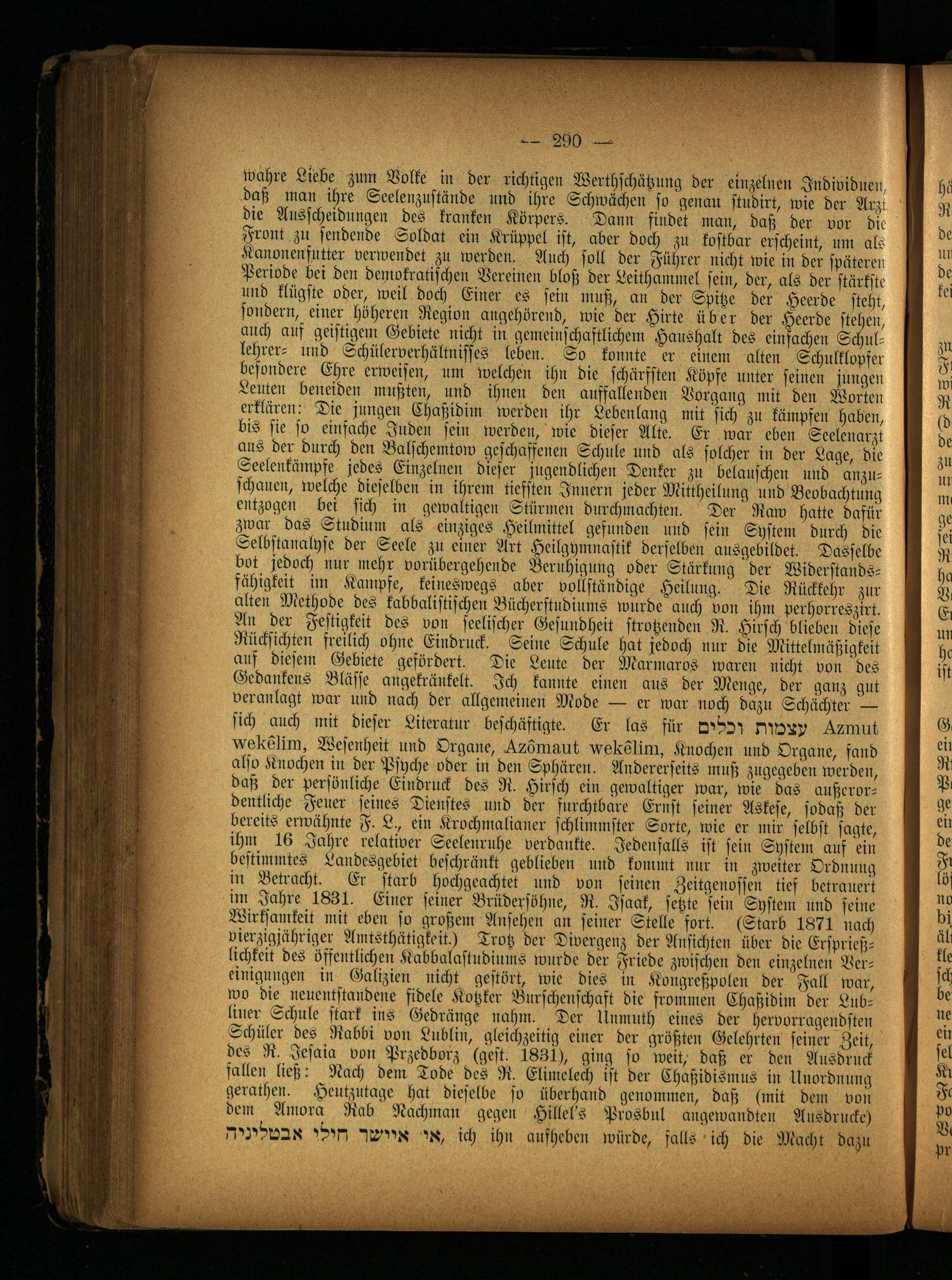 wahre Liebe zum Volke in der richtigen Wertschätzung der einzelnen Individuen, daß man ihre Seelenzustände und ihre Schwächen so genau studirt, wie der Arzt die Ausscheidungen des kranken Körpers. Dann findet man, daß der vor die Front zu sendende Soldat ein Krüppel ist, aber doch zu kostbar erscheint, um als Kanonenfutter verwendet zu werden. Auch soll der Führer nicht wie in der späteren Periode bei den demokratischen Vereinen bloß der Leithammel sein, der, als der stärkste und klügste oder, weil doch Einer es sein muß, au der Spitze der Heerde steht, sondern, einer höheren Region angehörend, wie der Hirte über der Heerde stehen, auch auf geistigem Gebiete nicht in gemeinschaftlichem Haushalt des einfachen Schullehrer- und Schülerverhältnisses leben. So konnte er einem alten Schulklopfer besondere Ehre erweisen, um welchen ihn die schärfsten Köpfe unter seinen jungen Leuten beneiden mußten, und ihnen den auffallenden Vorgang mit den Worten erklären: Die jungen Chaßidim werden ihr Lebenlang niit sich zu kämpfen haben, bis sie so einfache Juden sein werden, wie dieser Alte. Er war eben Seelenarzt ans der durch den Balschemtow geschaffenen Schule und als solcher in der Lage, die Seelenkämpfe jedes Einzelnen dieser jugendlichen Denker zu belauschen und anzuschauen, welche dieselben in ihrem tiefsten Innern jeder Mittheilnng und Beobachtung entzogen bei sich in gewaltigen Stürmen durchmachten. Der Raw hatte dafür zwar das Studium als einziges Heilmittel gefunden und sein System durch die Selbstanalyse der Seele zu einer Art Heilgymnastik derselben ansgebildet. Dasselbe bot jedoch nur mehr vorübergehende Beruhigung oder Stärkung der Widerstandsfähigkeit im Kampfe, keineswegs aber vollständige Heilung. Die Rückkehr zur alten Methode des kabbalistischen Bücherstudiums wurde auch von ihm perhorreszirt. An der Festigkeit des von seelischer Gesundheit strotzenden R. Hirsch blieben diese Rücksichten freilich ohne Eindruck. Seine Schule hat jedoch nur die Mittelmäßigkeit auf diesem Gebiete gefördert. Die Leute der Marmaros waren nicht von des