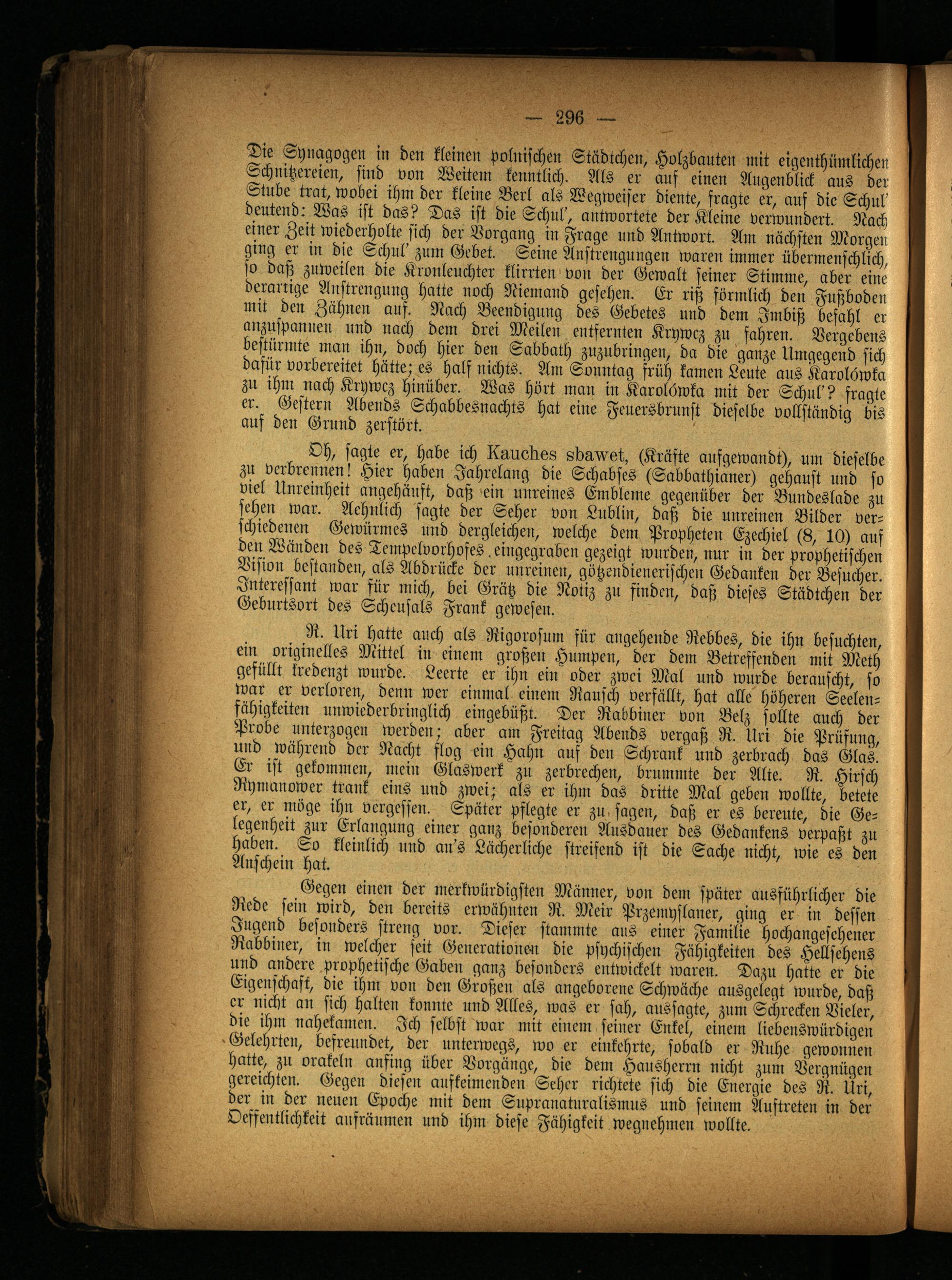 Die Synagogen in den kleinen polnischen Städtchen, Holzbauten mit eigenthümlichen Schnitzereien, sind von Weitem kenntlich. Als er ans einen Augenblick aus der Stube trat, wobei ihm der kleine Berl als Wegweiser diente, fragte er, aus die Schul' deutend: Was ist das? Das ist die Schul', antwortete der Kleine verwundert. Nach einer Zeit wiederholte sich der Vorgang in Frage und Antwort. Am nächsten Morgen ging er in die Schul' zum Gebet. Seine Anstrengungen waren immer übermenschlich, so daß zuweilen die Kronleuchter klirrten von der Gewalt seiner Stimme, aber eine derartige Anstrengung hatte noch Niemand gesehen. Er riß förmlich den Fußboden mit den Zähnen auf. Nach Beendigung des Gebetes und dem Imbiß befahl er anzuspannen und nach dem drei Meilen entfernten Krywcz zu fahren. Vergebens bestürmte man ihn, doch hier den Sabbath zuzubringen, da die ganze Umgegend sich dafür vorbereitet hätte; es half nichts. Am Sonntag früh kamen Leute aus Karolöwka zu ihm nach Krywcz hinüber. Was hört man in Karolöwka mit der Schul'? fragte er. Gestern Abends Schabbesnachts hat eine Feuersbrunst dieselbe vollständig bis auf den Grund zerstört.