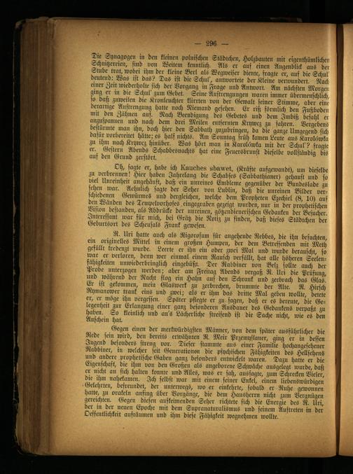 Gegen einen der merkwürdigsten Männer, von dem später ausführlicher die Rede sein wird, den bereits erwähnten R. Meir Przemyslaner, ging er in dessen Jugend besonders streng vor. Dieser stammte ans einer Familie hochangesehener Rabbiner, in welcher seit Generationen die psychischen Fähigkeiten des Hellsehens und andere prophetische Gaben ganz besonders entwickelt waren. Dazu hatte er die Eigenschaft, die ihm von den Großen als angeborene Schwäche ausgelegt wurde, daß er nicht an sich halten konnte und Alles, was er sah, aussagte, zum Schrecken Vieler, die ihm nahekamen. Ich selbst war mit einen: seiner Enkel, einem liebenswürdigen Gelehrten, befreundet, der unterwegs, wo er einkehrte, sobald er Ruhe gewonnen hatte, zu orakeln anfing über Vorgänge, die dem Hausherrn nicht zun: Vergnügen gereichten. Gegen diesen anfkeimcnden Scher richtete sich die Energie des R. Üri, der in der neuen Epoche mit dem Supranaturalismus und seinem Auftreten in der Oeffentlichkeit ansränmen und ihn: diese Fähigkeit wegnehinen wollte.