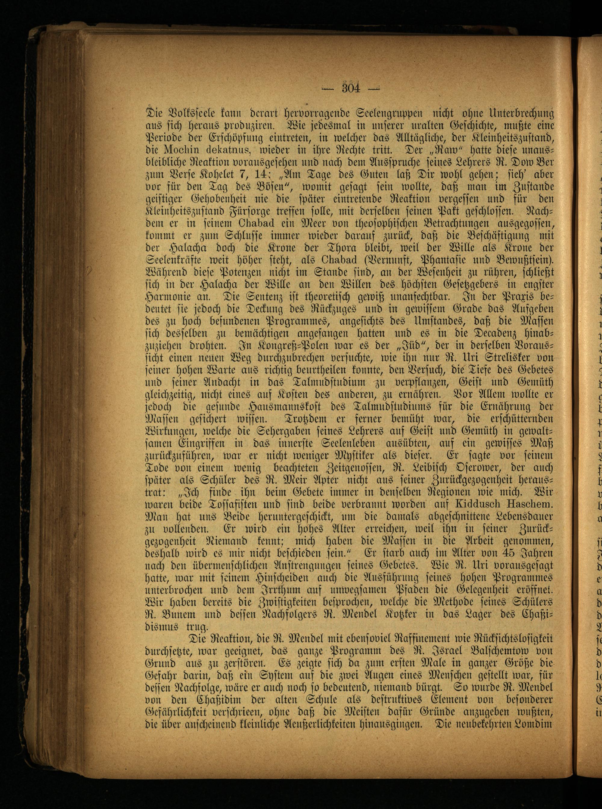 Die Volksseele kann derart hervorragende Seelengruppen nicht ohne Unterbrechung aus sich heraus produziren. Wie jedesmal in unserer uralten Geschichte, mußte eine Periode der Erschöpfung eintreten, in welcher das Alltägliche, der Kleinheitszustand, die Noobin äolcatnus, wieder in ihre Rechte tritt. Der „Raw" hatte diese unausbleibliche Reaktion vorausgesehen und nach dem Ausspruche seines Lehrers R. Dow Ber zum Verse Kohelet 7, 14: „Am Tage des Guten laß Dir wohl gehen; sieh' aber vor für den Tag des Bösen", womit gesagt sein wollte, daß man im Zustande geistiger Gehobeuheit nie die später eintretende Reaktion vergessen und für den Kleinheitszustand Fürsorge treffen solle, mit derselben seinen Pakt geschlossen. Nachdem er in seinem Otmbaä ein Meer von theosophischen Betrachtungen ausgegossen, kommt er zum Schlüsse immer wieder darauf zurück, daß die Beschäftigung mit der Halacha doch die Krone der Thora bleibt, weil der Wille als Krone der Seelenkräfte weit höher steht, als Otmbaä (Vernunft, Phantasie und Bewußtsein). Während diese Potenzen nicht im Stande sind, an der Wesenheit zu rühren, schließt sich in der Halacha der Wille an den Willen des höchsten Gesetzgebers in engster Harmonie an. Die Sentenz ist theoretisch gewiß unanfechtbar. In der Praxis bedeutet sie jedoch die Deckung des Rückzuges und in gewissem Grade das Aufgeben des zu hoch befundenen Programmes, angesichts des Umstandes, daß die Massen sich desselben zu bemächtigen angefangen hatten und es in die Decadenz hinabzuziehen drohten. In Kongreß-Polen war es der „Jüd", der in derselben Voraussicht einen neuen Weg durchzubrechen versuchte, wie ihn nur R. Uri Strelisker von seiner hohen Warte ans richtig benrtheilen konnte, den Versuch, die Tiefe des Gebetes und seiner Andacht in das Talmndstudium zu verpflanzen, Geist und Gemüth gleichzeitig, nicht eines ans Kosten des anderen, zu ernähren. Vor Allem wollte er jedoch die gesunde Hausmannskost des Talmudstudiums für die Ernährung der Massen gesichert wissen. Trotzdem er ferner bemüht war, die erschütternden Wirkungen, welche die Sehergaben seines Lehrers auf Geist und Gemüth in gewaltsamen Eingriffen in das innerste Seelenleben ausübten, auf ein gewisses Maß zurückzuführeu, war er nicht weniger Mystiker als dieser. Er sagte vor seinem