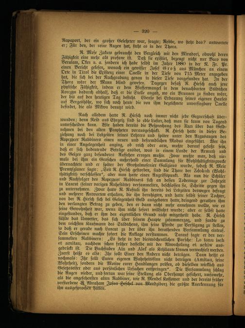 R. Mose Zakuto gebraucht den Vergleich mit den Miradori, obwohl deren Fähigkeit eine mehr als profane ist. Daß sie existirt, bezeugt nicht nur Baco von Verulam, Oken u. a. sondern ich habe selbst im Jahre 1880 in der N. Fr. Pr. einen Bericht gelesen, wonach ein gewisser Josef Groß ans München an einem Orte in Tirol die Existenz einer Quelle in der Tiefe von 715 Meter angegeben hat, die sich bei der Nachgrabung genau in dieser Tiefe vorgefunden hat. In der Thora wäre der Mann blind gewesen. Dagegen besaß R. Hirsch auch jene physische Fähigkeit, indem er dem Wassermangel in dein benachbarten Städtchen Korezyn dadurch abhalf, daß er die Stelle angab, wo ein Brunnen zn finden wäre, der bis auf den heutigen Tag besteht. Ebenso bei Erbauung seines eigenen Hauses ans Bergeshöhe, wo sich noch heute die von ihm bezeichnete unversiegbare Quelle befindet, die als Mikwa benutzt wird.