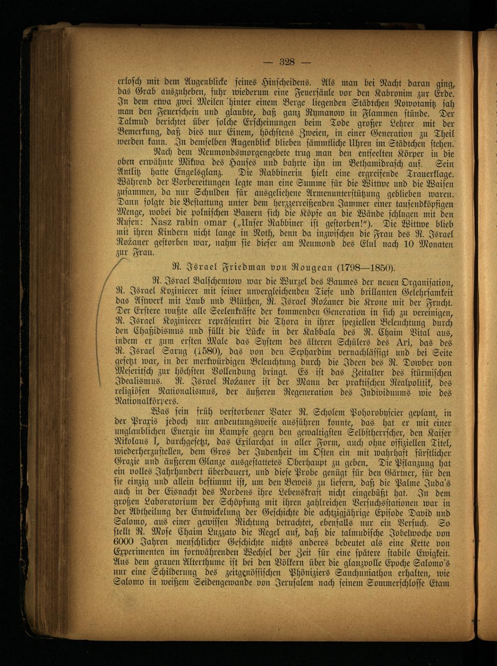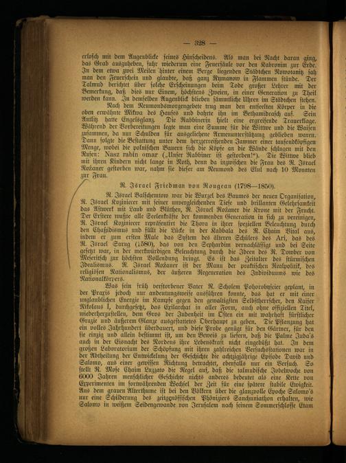 Nach dem Neumondsmorgengebete trug man den entseelten Körper in die oben erwähnte Mikwa des Hauses und bahrte ihn im Bethamidrasch auf. Sein Antlitz hatte Engelsglanz. Die Rabbinerin hielt eine ergreifende Trauerklage. Während der Vorbereitungen legte mau eine Summe für die Wittwe und die Waisen zusammen, da nur Schulden für ausgeliehene Armenunterstützuug geblieben waren. Dann folgte die Bestattung unter dem herzzerreißenden Jammer einer tausendköpfigen Menge, wobei die polnischen Bauern sich die Köpfe an die Wände schlugen mit den Rufen: iXu ,82 rudin oinnr („Unser Rabbiner ist gestorben!")- Die Wittwe blieb mit ihren Kindern nicht lange in Noth, denn da inzwischen die Frau des R. Israel Ro^aner gestorben war, nahm sie dieser am Neumond des Elul nach 10 Monaten zur Frau.