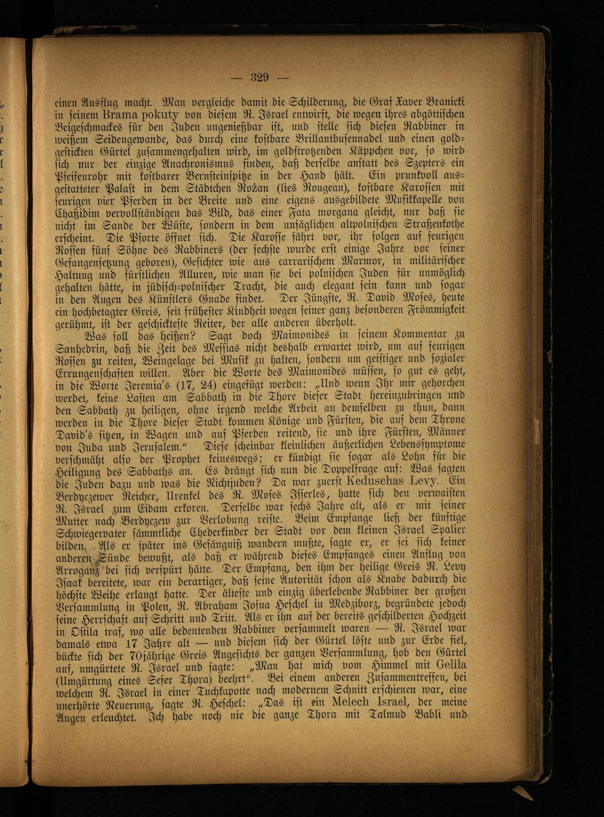 (Umgürtung eines Sefer Thora) beehrt". Bei einem anderen Zusammentreffen, bei welchem R. Israel in einer Tuchkapotte nach modernem Schnitt erschienen war, eine unerhörte Neuerung, sagte R. Heschel: „Das ist ein iUsieell Urnei, der meine Augen erleuchtet. Ich habe uoch nie die ganze Thora mit Talmud Babli und