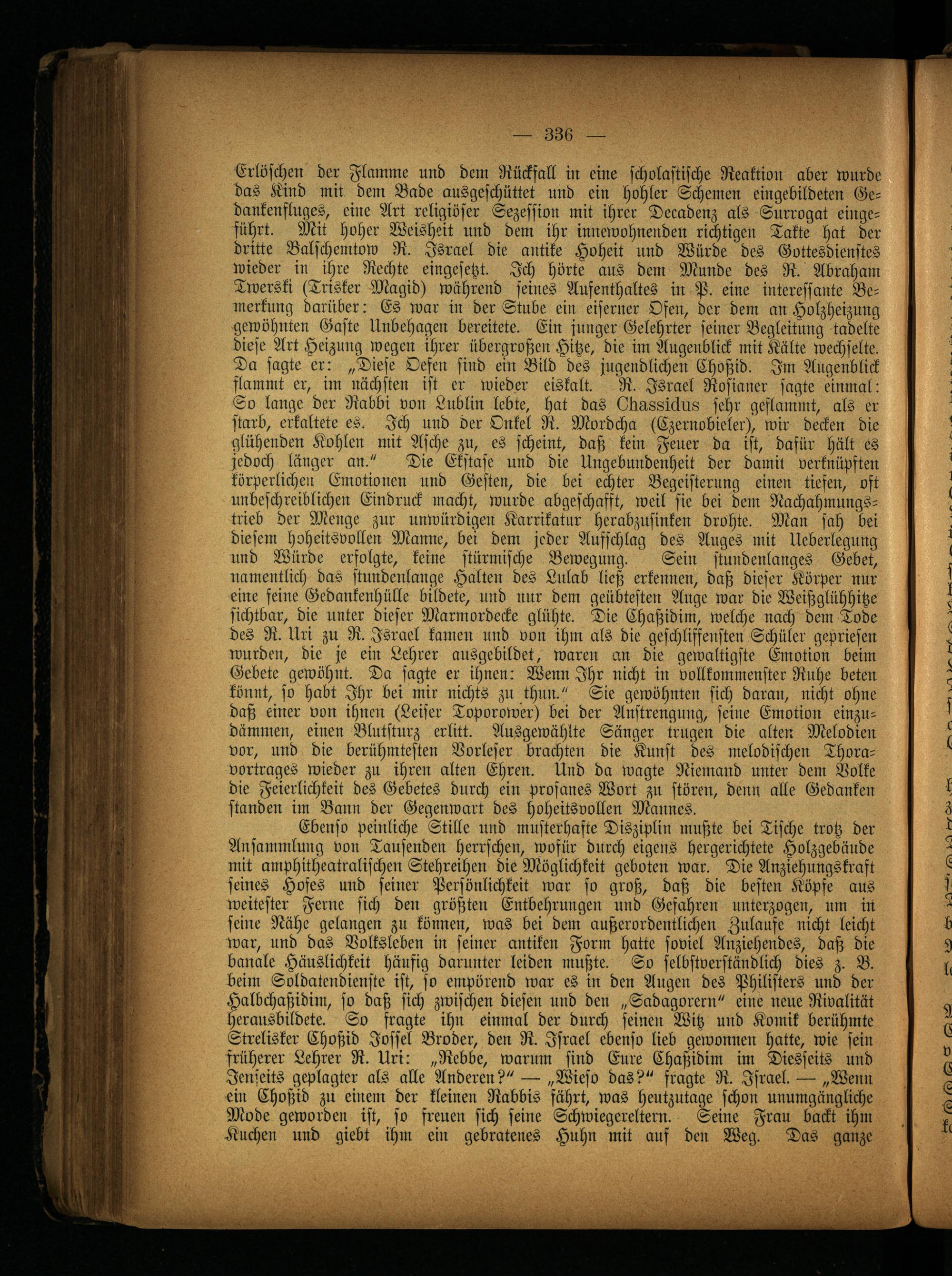 Erlöschen der Flamme und dem Rückfall in eine scholastische Reaktion aber wurde das Kind mit dem Bade ansgeschüttet und ein hohler Schemen eingebildeten Gc- dankenfluges, eine Art religiöser Sezession mit ihrer Decadenz als Surrogat eingeführt. Mit hoher Weisheit und dem ihr innewohnenden richtigen Takte hat der dritte Balschemtow R. Israel die antike Hoheit und Würde des Gottesdienstes wieder in ihre Rechte eingesetzt. Ich hörte aus dem Munde des R. Abraham Twerski (Trisker Magid) während seines Aufenthaltes in P. eine interessante Bemerkung darüber: Es war in der Stube ein eiserner Ofen, der dem an Holzheizung gewöhnten Gaste Unbehagen bereitete. Ein junger Gelehrter seiner Begleitung tadelte diese Art Heizung wegen ihrer übergroßen Hitze, die im Augenblick mit Kälte wechselte. Da sagte er: „Diese Oefen sind ein Bild des jugendlichen Choßid. Im Augenblick flammt er, im nächsten ist er wieder eiskalt. R. Israel Rosianer sagte einmal: So lange der Rabbi von Lublin lebte, hat das 0llg.88iäu8 sehr geflammt, als er starb, erkaltete es. Ich und der Onkel R. Mordcha (Czernobieler), wir decken die glühenden Kohlen mit Asche zu, es scheint, daß kein Feuer da ist, dafür hält es jedoch länger an." Die Ekstase und die Ungebundenheit der damit verknüpften körperlichen Emotionen und Gesten, die bei echter Begeisterung einen tiefen, oft unbeschreiblichen Eindruck macht, wurde abgeschafft, weil sie bei dem Nachahmungstrieb der Menge zur unwürdigen Karrikatur herabznsinken drohte. Man sah bei diesem hoheitsvollen Manne, bei dem jeder Aufschlag des Auges mit Ueberlegung und Würde erfolgte, keine stürmische Bewegung. Sein stundenlanges Gebet, namentlich das stundenlange Halten des Lnlab ließ erkennen, daß dieser Körper nur eine feine Gedankenhülle bildete, und nur dem geübtesten Auge war die Weißglühhitze sichtbar, die unter dieser Marmordecke glühte. Die Chaßidim, welche nach dem Tode des R. Uri zu R. Israel kamen und von ihm als die geschliffensten Schüler gepriesen wurden, die je ein Lehrer ansgebildet, waren an die gewaltigste Emotion beim Gebete gewöhnt. Da sagte er ihnen: Wenn Ihr nicht in vollkommenster Ruhe beten könnt, so habt Ihr bei mir nichts zu thun." Sie gewöhnten sich daran, nicht ohne daß einer von ihnen (Leiser Toporower) bei der Anstrengung, seine Emotion einzudämmen, einen Blutsturz erlitt. Ansgewählte Sänger trugen die alten Melodien vor, und die berühmtesten Vorleser brachten die Kunst des melodischen Thoravortrages wieder zu ihren alten Ehren. Und da wagte Niemand unter dem Volke die Feierlichkeit des Gebetes durch ein profanes Wort zu stören, denn alle Gedanken standen im Bann der Gegenwart des hoheitsvollen Mannes.