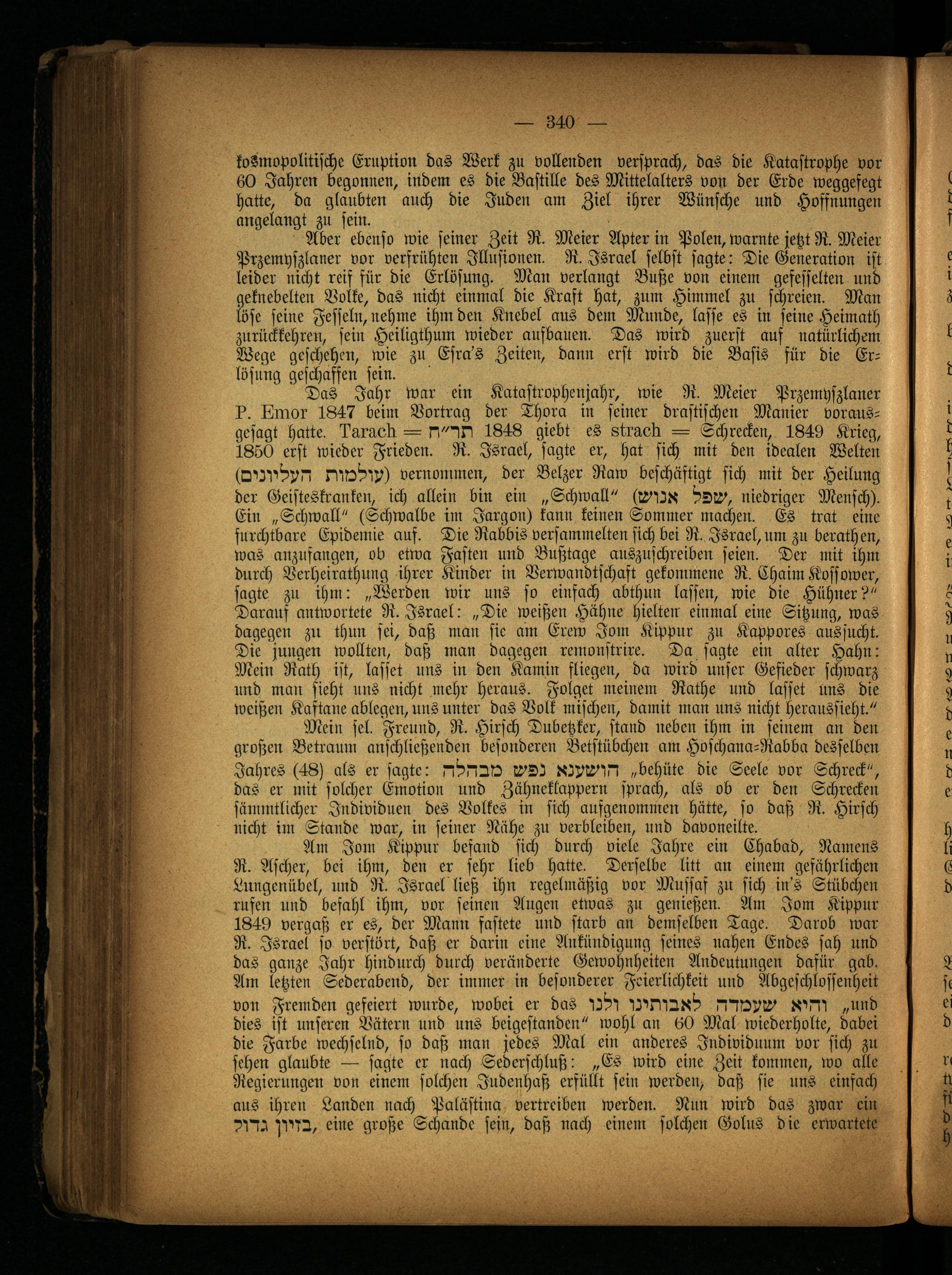 Ein „Schwall" (Schwalbe im Jargon) kann keinen Sommer machen. Es trat eine furchtbare Epidemie auf. Die Rabbis versammelten sich bei R. Israel,um zu berathen, was anzusaugen, ob etwa Fasten und Bußtage auszuschreiben seien. Der mit ihm durch Verheirathung ihrer Kinder in Verwandtschaft gekommene R. Chaim Koffower, sagte zu ihm: „Werden wir uns so einfach abthun lassen, wie die Hühner?" Daraus antwortete R. Israel: „Die weißen Hähne hielten einmal eine Sitzung, was dagegen zu thun sei, daß man sie am Erew Jom Kippur zu Kappores aussucht.