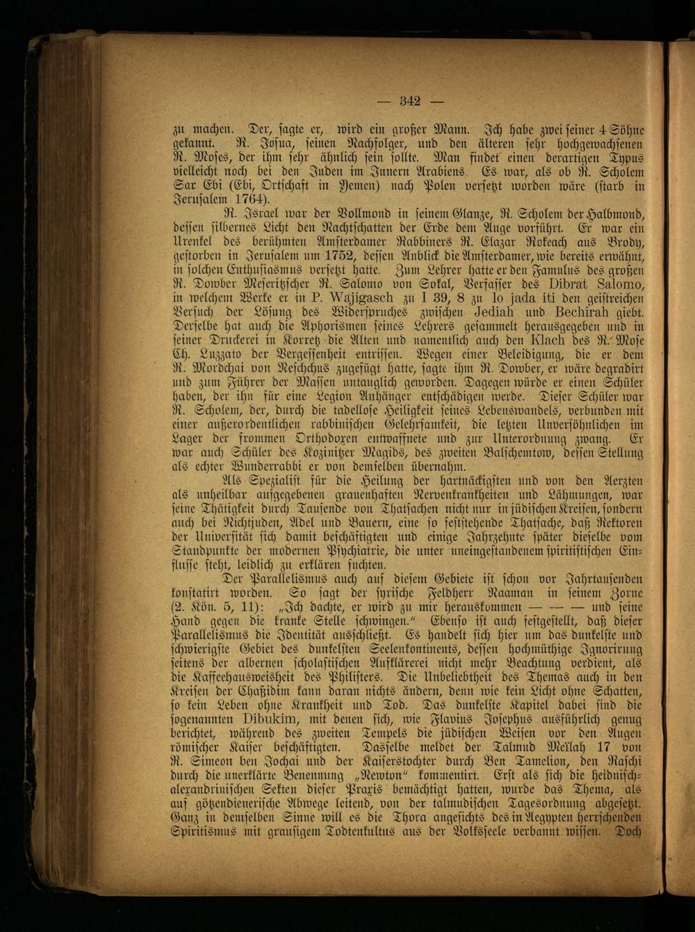 Als Spezialist für die Heilung der hartnäckigsten und von den Aerzten als unheilbar aufgegebenen grauenhaften Nervenkrankheiten und Lähmungen, war seine Thätigkeit durch Tausende von Thatsachen nicht nur in jüdischen Kreisen, sondern auch bei Nichtjuden, Adel und Bauern, eine so feststehende Thatsache, daß Rektoren der Universität sich damit beschäftigten und einige Jahrzehnte später dieselbe vom Standpunkte der modernen Psychiatrie, die unter uneingestandenem spiritistischen Einflüsse steht, leidlich zu erklären suchten.