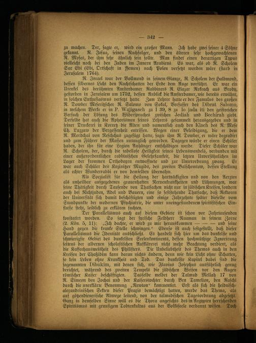 zu machen. Der, sagte er, wird ein großer Mann. Ich habe zwei seiner 4 Söhne gekannt. R. Josua, seinen Nachfolger, und den älteren sehr hochgewachsenen R. Moses, der ihm sehr ähnlich sein sollte. Man findet einen derartigen Typus vielleicht noch bei den Inden im Innern Arabiens. Es war, als ob R. Scholem Sar Ebi (Ebi, Ortschaft in Jemen) nach Polen versetzt worden wäre (starb in