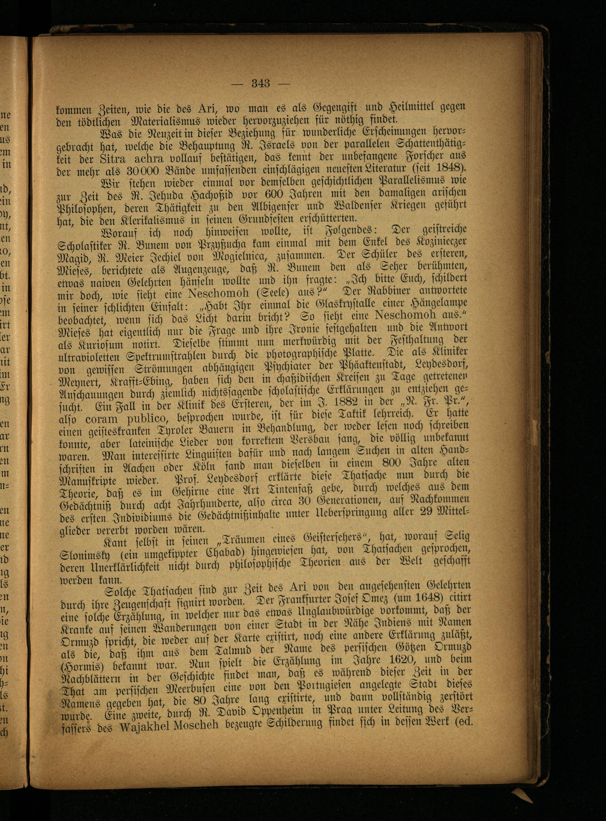 Scholastiker R. Bunem von Przyßucha kam einmal mit dem Enkel des Kozinieczer Magid, R. Meier Jechiel von Mogielnica, zusammen. Der Schüler des elfteren, Mieses, berichtete als Augenzeuge, daß R. Bunem den als Seher berühmten, etwas naiven Gelehrten hänseln wollte und ihn fragte: „Ich bitte Euch, schildert mir doch, wie sieht eine idissellonloli (Seele) ans?" Der Rabbiner antwortete in seiner schlichten Einfalt: „Habt Ihr einmal die Glaskrystalle einer Hängelampe beobachtet, wenn sich das Licht darin bricht? So sieht eine lXsscllomoll ans." Mieses hat eigentlich nur die Frage und ihre Ironie festgehalten und die Antwort als Kuriosum notirt. Dieselbe stimmt nun merkwürdig mit der Festhaltnng der ultravioletten Spektrumstrahlen durch die photographische Platte. Die als Kliniker von gewissen Strömungen abhängigen Psychiater der Phäaktmstadt, Leydesdorf, Meynert, Krafft-Ebing, haben sich den in chaßidischen Kreisen zu Tage getretenen Anschauungen durch ziemlich nichtssagende scholastische Erklärungen zu entziehen gesucht. Ein Fall in der Klinik des Erstereu, der im I. 1882 in der „N. Fr. Pr.", also eoruin publioo, besprochen wurde, ist für diese Taktik lehrreich. Er hatte einen geisteskranken Tyroler Bauern in Behandlung, der weder lesen noch schreiben konnte, aber lateinische Lieder von korrektem Versbau sang, die völlig unbekannt waren. Mail iuteressirte Linguisten dafür und nach langem Suchen in alten Handschriften in Aachen oder Köln fand man dieselben in einem 800 Jahre alten Manuskripte wieder. Prof. Leydesdorf erklärte diese Thatsache nun durch die Theorie, daß es im Gehirne eine Art Tintenfaß gebe, durch welches aus dem Gedächtniß durch acht Jahrhunderte, also circa 30 Generationen, auf Nachkommen des ersten Jndividiums die Gedächtnißinhalte unter Ucberspringung aller 29 Mittelglieder vererbt worden wären.