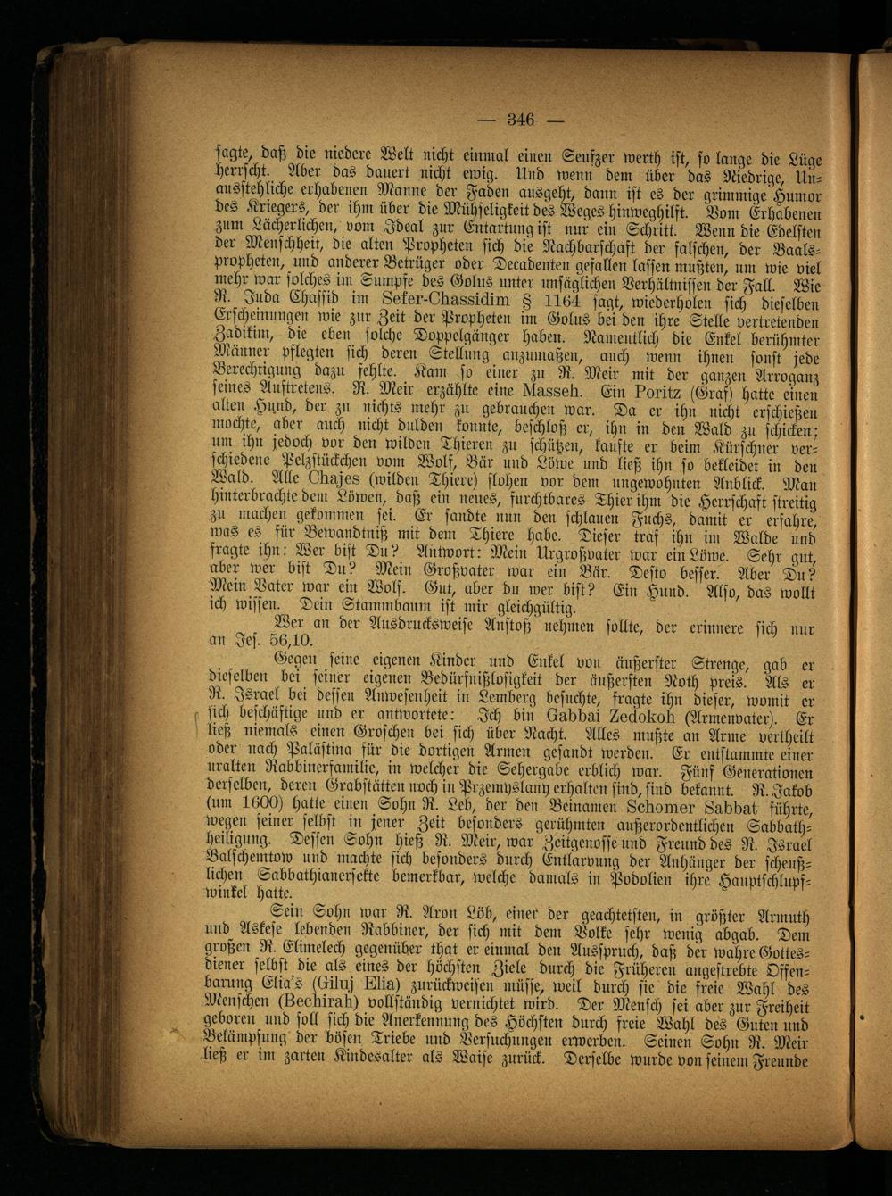 ließ niemals einen Groschen bei sich über Nacht. Alles mußte an Arme vertheilt oder nach Palästina für die dortigen Armen gesandt werden. Er entstammte einer uralten Rabbinerfamilie, in welcher die Sehergabe erblich war. Fünf Generationen derselben, derer: Grabstätten noch in Przemyslcmy erhalten sind, sind bekannt. R. Jakob (um 1600) hatte einen Sohn R. Leb, der den Beinamen Losiomsr Ludbut führte, wegen seiner selbst irr jener Zeit besonders gerühmten außerordentlichen Sabbath- heiligung. Dessen Sohn hieß R. Meir, war Zeitgenosse und Freund des R. Israel Balschemtow und machte sich besonders durch Entlarvung der Anhänger der scheußlichen Sabbathianersekte bemerkbar, welche damals in Podolien ihre Hauptschlupswinkel hatte.