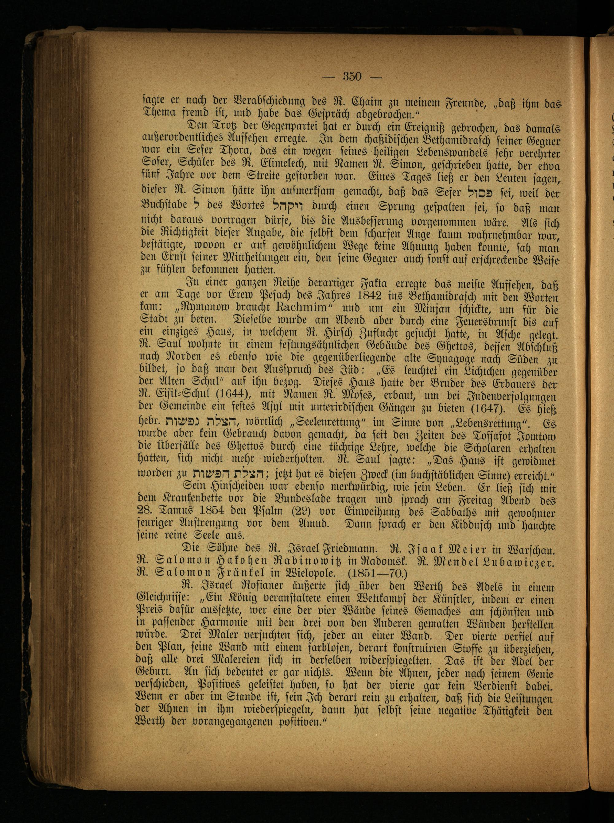 In einer ganzen Reihe derartiger Fakta erregte das meiste Aufsehen, daß er am Tage vor Erew Pesach des Jahres 1842 ins Bethamidrasch mit den Worten kam: „Rymanow braucht üuedniim" und um ein Minjan schickte, um für die Stadt zu beten. Dieselbe wurde am Abend aber durch eine Feuersbrunst bis auf ein einziges Haus, in welchem R. Hirsch Zuflucht gesucht hatte, in Asche gelegt. R. Saul wohnte in einem festungsähnlichen Gebäude des Ghettos, dessen Abschluß nach Norden es ebenso wie die gegenüberliegende alte Synagoge nach Süden zu bildet, so daß man den Ausspruch des Jüd: „Es leuchtet ein Lichtchen gegenüber der Alten Schirl" aus ihn bezog. Dieses Hans hatte der Bruder des Erbauers der R. Eisik-Schul (1644), mit Rainen R. Moses, erbaut, um bei Judenverfolgungen der Gemeinde ein festes Asyl mit unterirdischen Gängen zu bieten (1647). Es hieß hebr. ^11^21 wörtlich „Seelenrettung" im Sinne von „Lebensrettung". Es