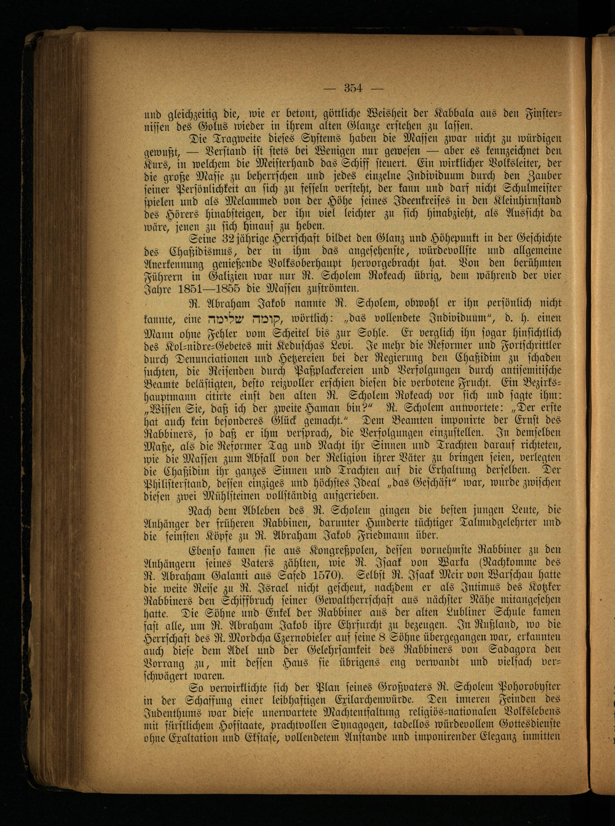 Mann ohne Fehler vom Scheitel bis zur Sohle. Er verglich ihn sogar hinsichtlich des Kol-nidre-Gebetes mit Keduschas Levi. Je mehr die Reformer und Fortschrittler durch Denunciationen und Hetzereien bei der Regierung den Chaßidim zu schaden suchten, die Reisenden durch Paßplackereien und Verfolgungen durch antisemitische Beamte belästigten, desto reizvoller erschien diesen die verbotene Frucht. Ein Bezirkshauptmann citirte einst den alten R. Scholem Rokeach vor sich und sagte ihm: „Wissen Sie, daß ich der zweite Haman bin?" R. Scholem antwortete: „Der erste hat auch kein besonderes Glück gemacht." Dem Beamten imponirte der Ernst des Rabbiners, so daß er ihm versprach, die Verfolgungen einzustelleu. In demselben Maße, als die Reformer Tag und Nacht ihr Sinnen und Trachten darauf richteten, wie die Massen zum Abfall von der Religion ihrer Väter zu bringen seien, verlegten die Chaßidim ihr ganzes Sinnen und Trachten auf die Erhaltung derselben. Der Philisterstand, dessen einziges und höchstes Ideal „das Geschäft" war, wurde zwischen diesen zwei Mühlsteinen vollständig aufgerieben.