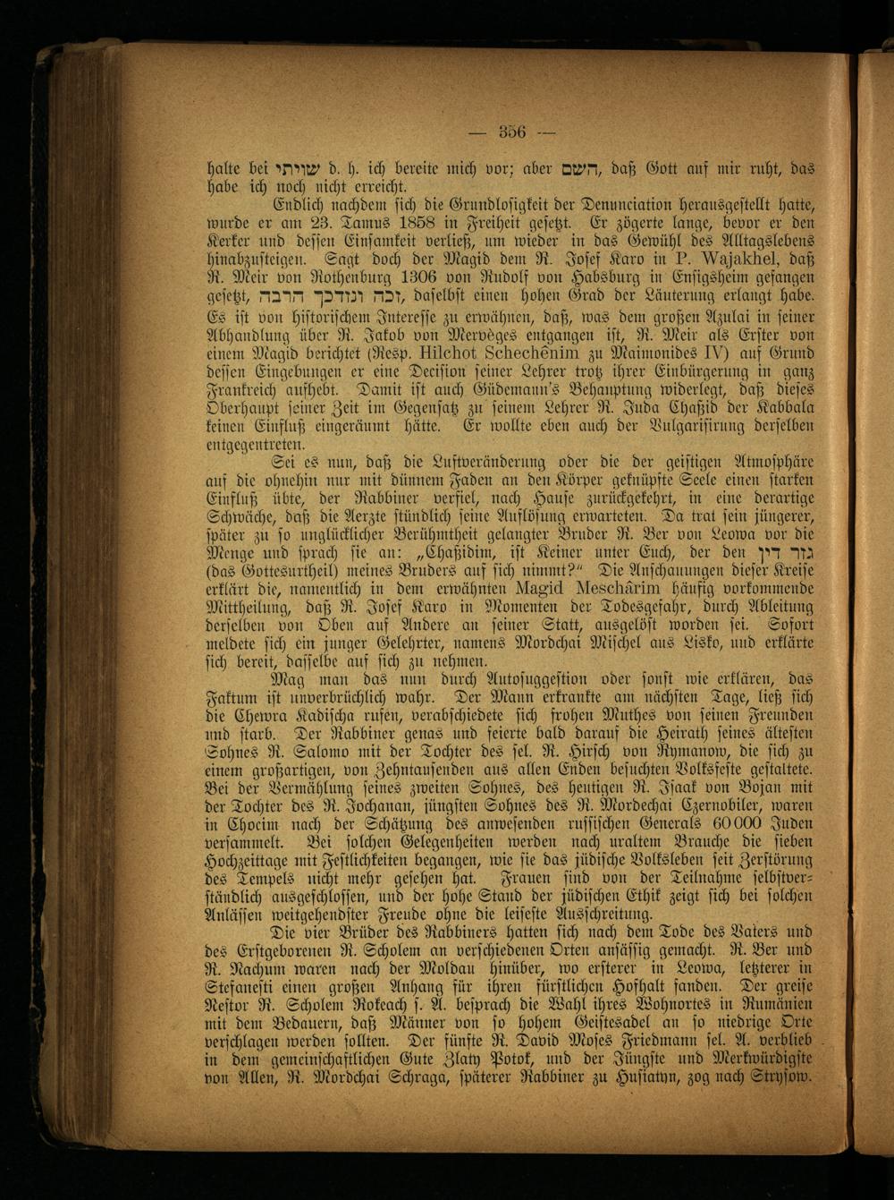 Sei es nun, daß die Luftveränderung oder die der geistigen Atmosphäre auf die ohnehin nur mit dünnem Faden an den Körper geknüpfte Seele einen starken Einfluß übte, der Rabbiner verfiel, nach Hause zurückgekehrt, in eine derartige Schwäche, daß die Aerzte stündlich seine Auflösung erwarteten. Da trat sein jüngerer, später zu so unglücklicher Berühmtheit gelangter Bruder R. Ber von Leowa vor die Menge und sprach sie an: „Chaßidim, ist Keiner unter Euch, der den Hl (das Gottesurtheil) meines Bruders auf sich nimmt?" Die Anschauungen dieser Kreise erklärt die, namentlich in dem erwähnten UuKiä Nesollärim häufig vorkommende Mittheilung, daß R. Josef Karo in Momenten der Todesgefahr, durch Ableitung derselben von Oben auf Andere an seiner Statt, ausgelöst worden sei. Sofort meldete sich ein junger Gelehrter, namens Mordchai Mischet aus Lisko, und erklärte sich bereit, dasselbe auf sich zu nehmen.