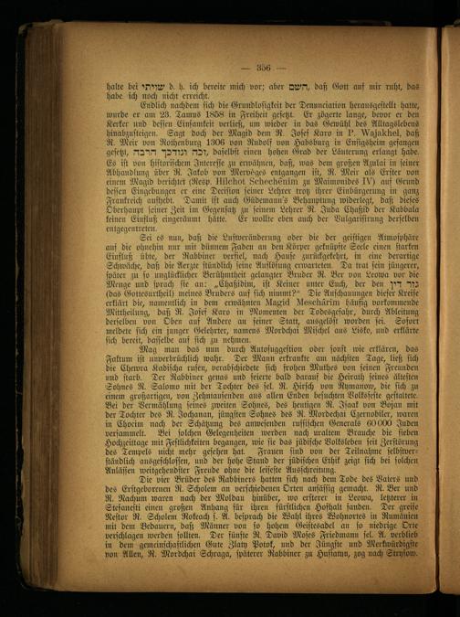 Mag man das nun durch Autosuggestion oder sonst wie erklären, das Faktum ist unverbrüchlich wahr. Der Mann erkrankte am nächsten Tage, ließ sich die Chewra Kndischa rufen, verabschiedete sich frohen Muthes von seinen Freunden und starb. Der Rabbiner genas und feierte bald darauf die Heirath seines ältesten Sohnes R. Salomo mit der Tochter des sel. R. Hirsch von Rymanow, die sich zu einem großartigen, von Zehntausenden aus allen Enden besuchten Volksfeste gestaltete. Bei der Vermählung seines zweiten Sohnes, des heutigen R. Isaak von Bojan mit der Tochter des R. Jochanan, jüngsten Sohnes des R. Mvrdechai Czernobiler, waren in Chocim nach der Schätzung des anwesenden russischen Generals 60000 Juden versammelt. Bei solchen Gelegenheiten werden nach uraltem Brauche die sieben Hochzeittage mit Festlichkeiten begangen, wie sie das jüdische Volksleben seit Zerstörung des Tempels nicht mehr gesehen hat. Frauen sind von der Teilnahme selbstverständlich ausgeschlossen, und der hohe Stand der jüdischen Ethik zeigt sich bei solchen Anlässen weitgehendster Freude ohne die leiseste Ausschreitung.