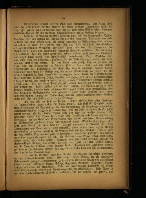 Da liegt also der Hase im Pfeffer. Immer dieselbe Leier aller Irrlehren seit Jahrtausenden, gegen welche die Thora kämpft. Die klassische Frechheit, welche diese Vereinigung als Gegensatz zu der von Balschemtow als Grundlage aufgestellten Selbstzerbrochenheit (NlMkl) zur Schau trug, war am Ende durch den Kotzker selbst gerügt worden, als ihm dieser Schüler über den Kopf zu wachsen begann. Sie besprachen einmal das Thema der ckeälak und Iloeluruk und kamen auf den Or iluollggiin, der am Ende von ?, korobotiit dem Rubock aus seiner Bevormundung des Maimonides bei dieser Frage einen Vorwurf macht. Mordcha Josef sagte: „der steckt auch überall die Nase hinein." Darauf antwortete R. Mendel mit einem Talmudworte aus Sota, es sei böse Hinterlist, einem andern seine eigene Ansicht unterschieben zu wollen, womit er die Gemeinschaft mit ihm ablehnte. Da er aber als der richtige Scharfmacher galt, so sammelte er gerade die schärfsten und kecksten unter den jungen Gelehrten um sich. Er überlebte seine Lehrer jedoch nicht lange, ebenso wenig sein Sohn Jakob. Dagegen war sein Onkel Verschon Henoch ein psychologisches Räthsel, das oukrmt torribls seiner Zeit, eine Art live kor Lutun, wie R. Dosa im Talmud seinen jungen Bruder Jonathan ben Hyrckanos nannte, vor dem er die Gelehrten warnte, und der, als R. Akiba doch mit ihm zusammentraf, ihm eine saftige Grobheit sagte.