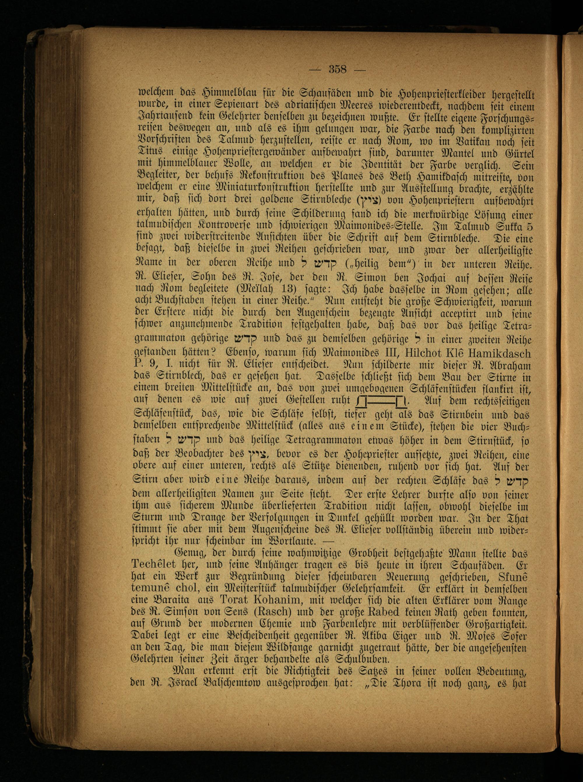 daß der Beobachter des bevor es der Hohepriester aufsetzte, zwei Reihen, eine obere auf einer unteren, rechts als Stütze dienenden, ruhend vor sich hat. Auf der Stirn aber wird eine Reihe daraus, indem auf der rechten Schläfe das ? irNs) dein allerheiligsten Namen zur Seite steht. Der erste Lehrer durste als» von seiner ihm aus sicherem Munde überlieferten Tradition nicht lassen, obwohl dieselbe im Sturm und Drange der Verfolgungen in Dunkel gehüllt worden war. In der That stimmt sie aber mit dem Augenscheine des R. Elieser vollständig überein und widerspricht ihr nur scheinbar im Wortlaute. —