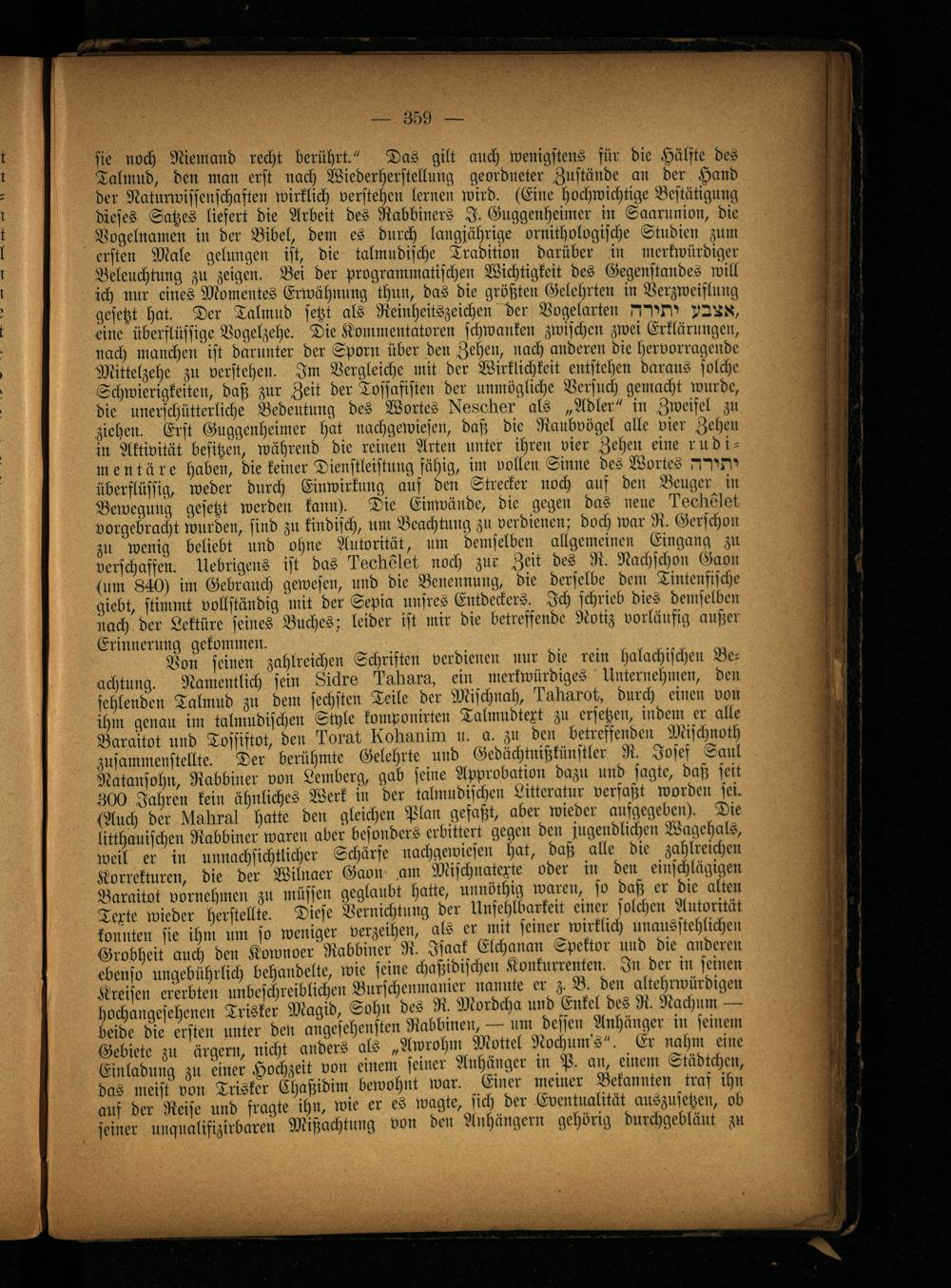 sie noch Niemand recht berührt." Das gilt auch wenigstens für die Hälfte des Talmud, den man erst nach Wiederherstellung geordneter Zustände an der Hand der Naturwissenschaften wirklich verstehen lernen wird. (Eine hochwichtige Bestätigung dieses Satzes liefert die Arbeit des Rabbiners I. Guggenheimer in Saarunion, die Vogelnamen in der Bibel, dem es durch langjährige ornitholvgische Studien zum ersten Male gelungen ist, die talmudische Tradition darüber in merkwürdiger Beleuchtung zu zeigen. Bei der programmatischen Wichtigkeit des Gegenstandes will ich nur eines Momentes Erwähnung thun, das die größten Gelehrten in Verzweiflung gesetzt hat. Der Talmud setzt als Reinheitszeichen der Vvgelarten P22X,