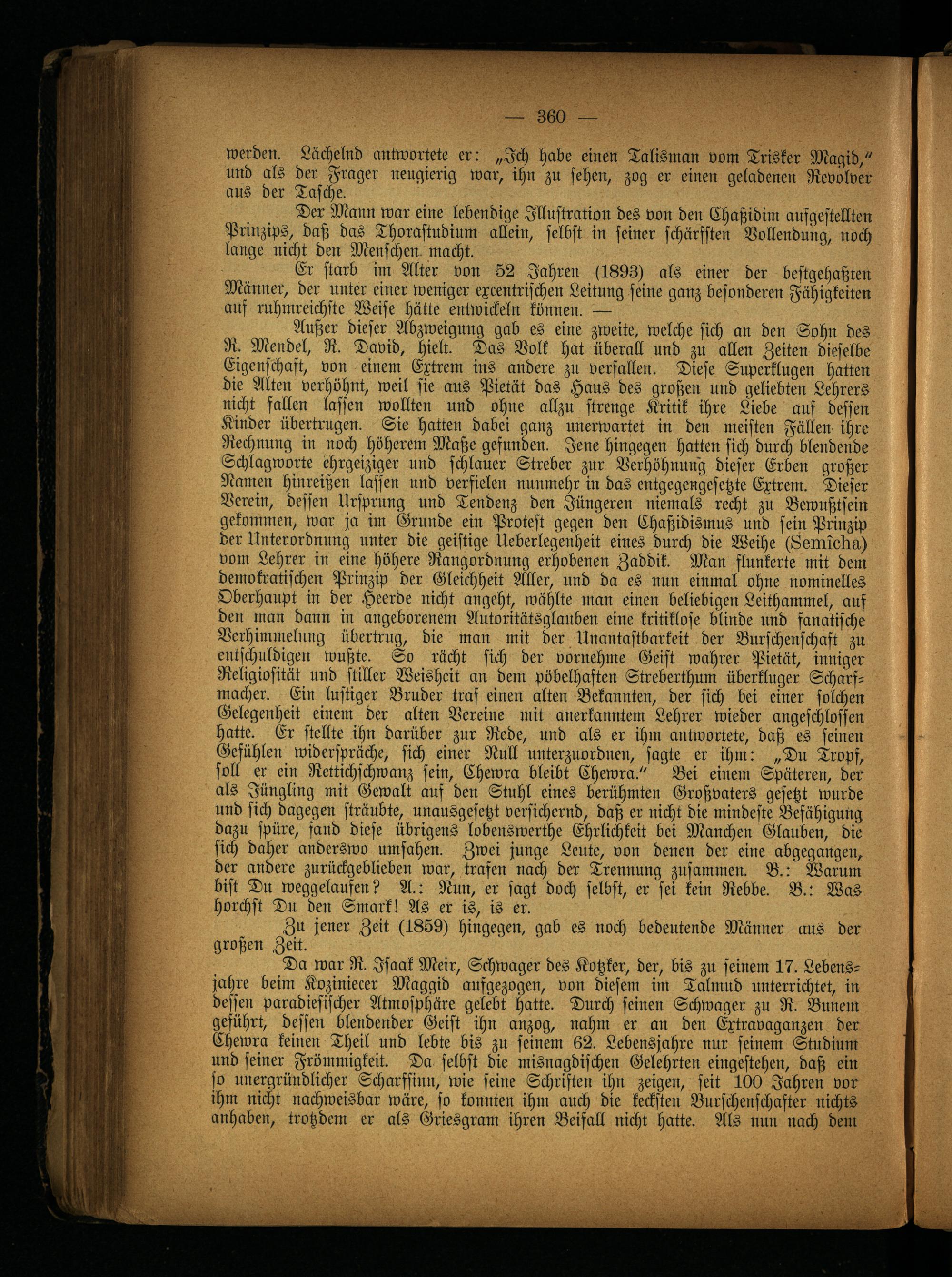 Da war R. Isaak Mein, Schwager des Kotzker, der, bis zu seinem 17. Lebensjahre beim Koziniecer Maggid aufgezogen, von diesem im Talmud unterrichtet, in dessen paradiesischer Atmosphäre gelebt hatte. Durch seinen Schwager zu R. Bunem geführt, dessen blendender Geist ihn anzog, nahm er an den Extravaganzen der Chewra keinen Theil und lebte bis zu seinem 62. Lebensjahre nur seinem Studium und seiner Frömmigkeit. Da selbst die misnagdischen Gelehrten eingestehen, daß ein so unergründlicher Scharfsinn, wie seine Schriften ihn zeigen, seit 100 Jahren vor ihm nicht nachweisbar wäre, so konnten ihm auch die kecksten Burschenschafter nichts anhaben, trotzdem er als Griesgram ihren Beifall nicht hatte. Als nun nach dem