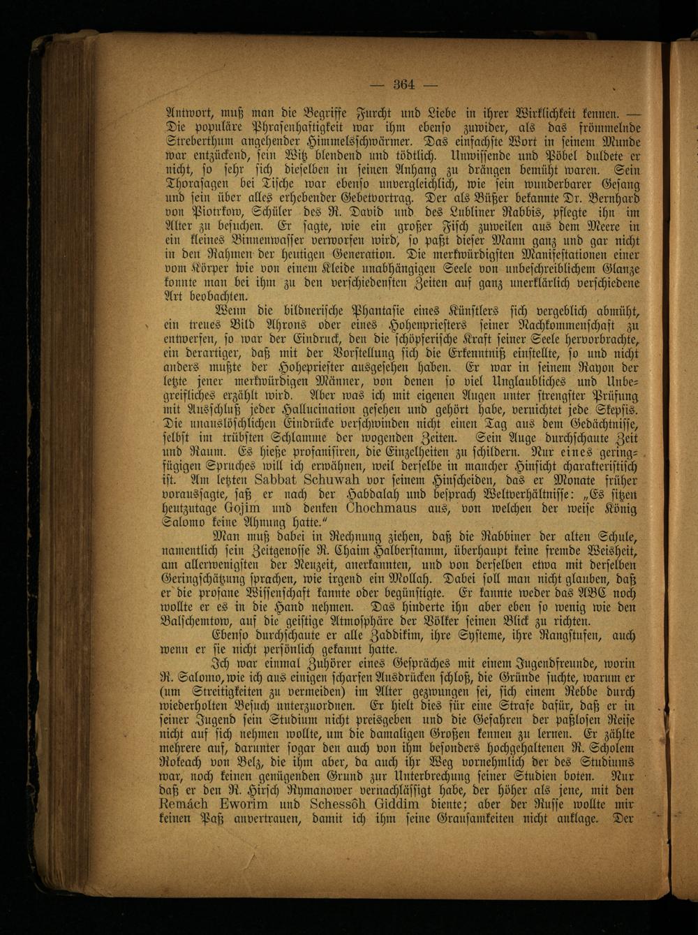 Man muß dabei in Rechnung ziehen, daß die Rabbiner der alten Schule, namentlich sein Zeitgenosse R. Chaim Halberstamm, überhaupt keine fremde Weisheit, am allerwenigsten der Neuzeit, anerkannten, und von derselben etwa mit derselben Geringschätzung sprachen, wie irgend ein Mollah. Dabei soll man nicht glauben, daß er die profane Wissenschaft kannte oder begünstigte. Er kannte weder das ABC noch wollte er es in die Hand nehmen. Das hinderte ihn aber eben so wenig wie den Balschemtow, auf die geistige Atmosphäre der Völker seinen Blick zu richten.