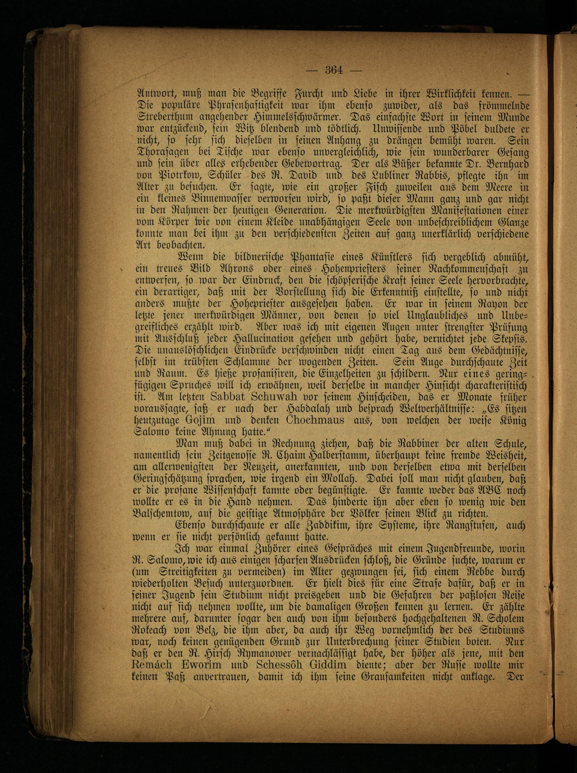 Ich war einmal Zuhörer eines Gespräches mit einem Jugendfreunde, worin R. Salomo, wie ich aus einigen scharfen Ausdrücken schloß, die Gründe suchte, warum er (um Streitigkeiten zu vermeiden) im Alter gezwungen sei, sich einem Rebbe durch wiederholten Besuch unterzuordnen. Er hielt dies für eine Strafe dafür, daß er in seiner Jugend sein Studium nicht Preisgeben und die Gefahren der paßlosen Reise nicht auf sich nehmen wollte, um die damaligen Großen kennen zu lernen. Er zählte mehrere auf, darunter sogar den auch von ihm besonders hochgehaltenen R. Scholem Rokeach von Belz, die ihm aber, da auch ihr Weg vornehmlich der des Studiums war, noch keinen genügenden Grund zur Unterbrechung seiner Studien boten. Nur daß er den R. Hirsch Rymanower vernachlässigt habe, der höher als jene, mit den Uomäcft ftftvorim und LefteWoft (iicidiin diente; aber der Russe wollte mir keinen Paß anvertrauen, damit ich ihm seine Grausamkeiten nicht anklage. Der