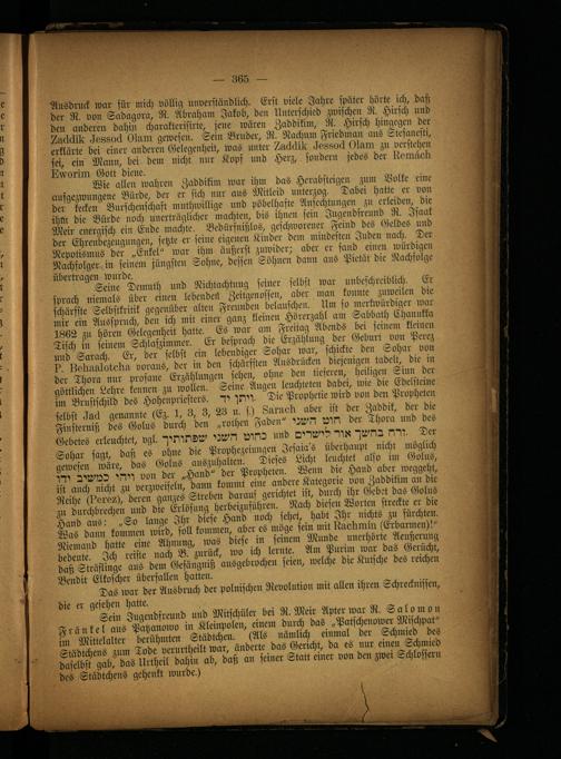 Ausdruck war für mich völlig unverständlich. Erst viele Jahre später hörte ich, daß der R. von Sadagora, R. Abraham Jakob, den Unterschied zwischen R. Hirsch nnd den anderen dahin charakterisirte, jene wären Zaddikim, R. Hirsch Hingegen der