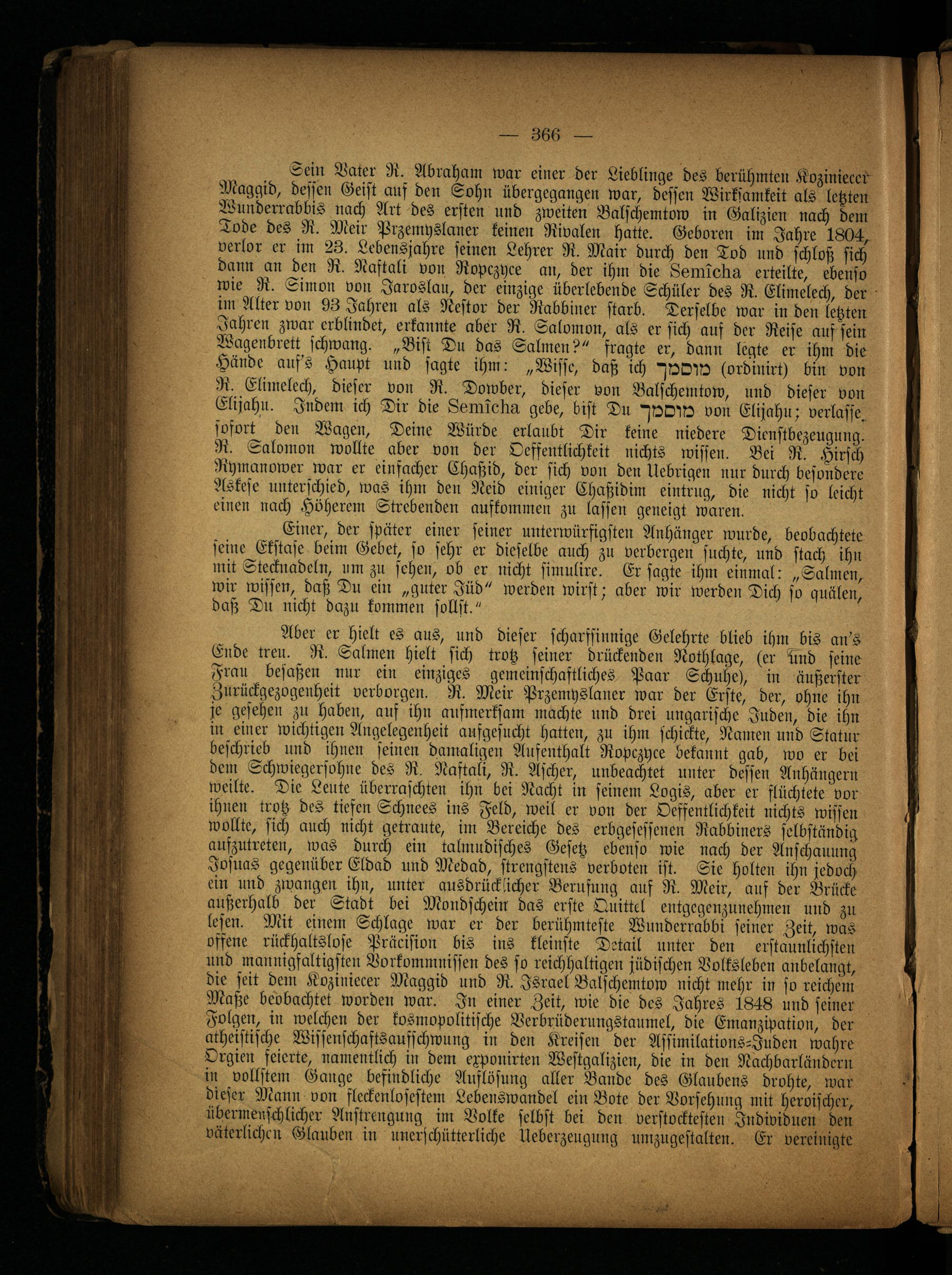 Aber er hielt es aus, und dieser scharfsinnige Gelehrte blieb ihm bis an's Ende treu. R. Salmen hielt sich trotz seiner drückenden Nothlage, (er irnd seine Mau besaßen nur ein einziges gemeinschaftliches Paar Schuhe), in äußerster Zurückgezogenheit verborgen. R. Meir Przemyslaner war der Erste, der, ohne ihn je gesehen zu haben, auf ihn aufmerksam machte und drei ungarische Juden, die ihn in einer wichtigen Angelegenheit ausgesucht hatten, zu ihm schickte, Namen und Statur beschrieb und ihnen seinen damaligen Aufenthalt Ropczyce bekannt gab, wo er bei dem Schwiegersöhne des R. Nastali, R. Ascher, unbeachtet unter dessen Anhängern weilte. Die Leute überraschten ihn bei Nacht in seinem Logis, aber er flüchtete vor ihnen trotz des tiefen Schnees ins Feld, weil er von der Oefsentlichkeit nichts wissen wollte, sich auch nicht getraute, im Bereiche des erbgesessenen Rabbiners selbständig aufzutreten, was durch ein talmndisches Gesetz ebenso wie nach der Anschauung Josuas gegenüber Eldad und Medad, strengstens verboten ist. Sie holten ihn jedoch ein und zwangen ihn, unter ausdrücklicher Berufung auf R. Meir, auf der Brücke außerhalb der Stadt bei Mondschein das erste Quittel entgcgenzunehmen und zu lesen. Mit einem Schlage war er der berühmteste Wunderrabbi seiner Zeit, was offene rückhaltslose Präcision bis ins kleinste Detail unter den erstaunlichsten und mannigfaltigsten Vorkommnissen des so reichhaltigen jüdischen Volksleben anbelangt, die seit dem Koziniecer Maggid und R. Israel Balschemtow nicht mehr in so reichem Maße beobachtet worden war. In einer Zeit, wie die des Jahres 1848 und seiner Folgen, in welchen der kosmopolitische Verbrüderungstaumel, die Emanzipation, der atheistische Wissenschaftsausschwnng in den Kreisen der Assimilations-Inden wahre Orgien feierte, namentlich in dem exponirte» Westgalizien, die in den Nachbarländern in vollsten! Gange befindliche Auslösung aller Bande des Glaubens drohte, war dieser Mann von fleckenlosestem Lebenswandel ein Bote der Vorsehung mit heroischer, übermenschlicher Anstrengung im Volke selbst bei den verstocktesten Individuen den väterlichen Glauben in unerschütterliche kkeberzeugung umzugestalten. Er vereinigte