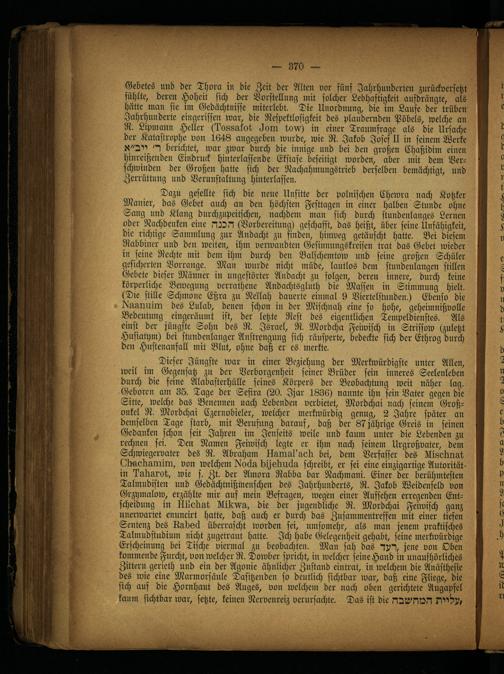 Dazu gesellte sich die neue Unsitte der polnischen Chewra nach Kotzker Manier, das Gebet auch an den höchsten Festtagen in einer halben Stunde ohne Sang und Klang durchzupeitschen, nachdem man sich durch stundenlanges Lernen oder Nachdenken eine N12N (Vorbereitung) geschafft, das heißt, über seine Unfähigkeit, die richtige Sammlung zur Andacht zu finden, hinweg getäuscht hatte. Bei diesem Rabbiner und den weiten, ihm verwandten Gesinnungskreisen trat das Gebet wieder in seine Rechte mit dem ihm durch den Balschemtow und seine großen Schüler gesicherten Vorrange. Man wurde nicht müde, lautlos dem stundenlangen stillen Gebete dieser Männer in ungestörter Andacht zu folgen, deren innere, durch keine körperliche Bewegung verrathene Andachtsgluth die Massen in Stimmung hielt. (Dre stille Schmone Eßra zu Neilah dauerte einmal 9 Viertelstunden.) Ebenso die idiggnuim des Lulab, denen schon in der Mischnah eine so hohe, geheimnißvolle Bedeutung eingeräumt ist, der letzte Rest des eigentlichen Tempeldienstes. Als einst der jüngste Sohn des R. Israel, R. Mordcha Feiwisch in Strissow (zuletzt Husiatym) bei stundenlanger Anstrengung sich räusperte, bedeckte sich der Ethrog durch den Hustenanfall mit Blut, ohne daß er es merkte.