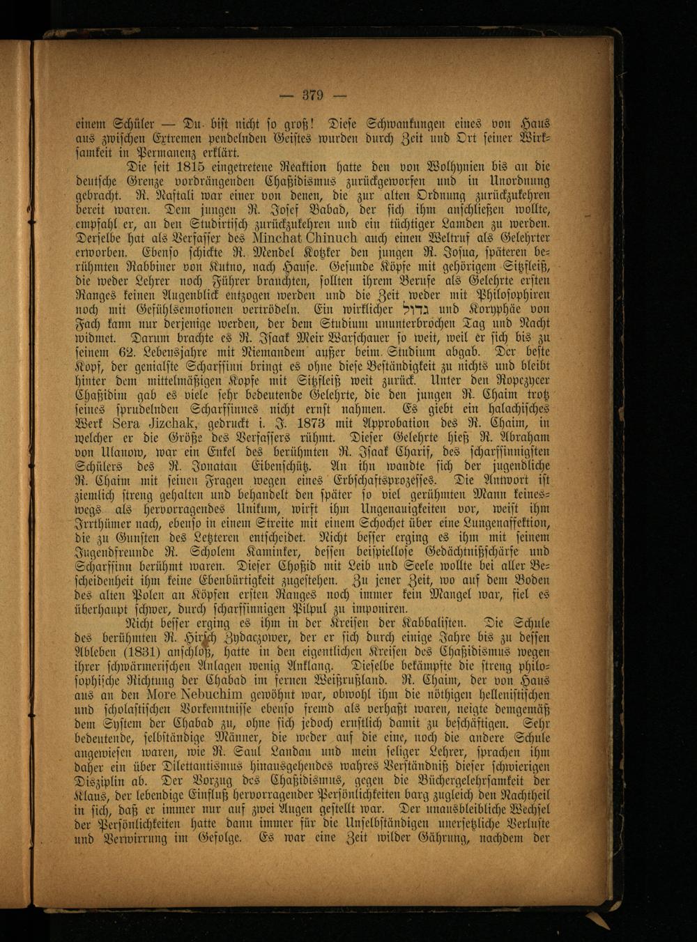 Nicht besser erging es ihm in der Kreisen der Kabbalisten. Die Schule des berühmten R. Hirsth Zydaczower, der er sich durch einige Jahre bis zu dessen Ableben (1831) anschloß, hatte in den eigentlichen Kreisen des Chaßidismns wegen ihrer schwärmerischen Anlagen wenig Anklang. Dieselbe bekämpfte die streng philosophische Richtung der Chabad im fernen Weißrußland. R. Chaim, der von Haus aus an den iUvrs biebueiUnr gewöhnt war, obwohl ihm die nöthigen hellenistischen und scholastischen Vorkenntnisse ebenso fremd als verhaßt waren, neigte demgemäß dem System der Chabad zu, ohne sich jedoch ernstlich damit zu beschäftigen. Sehr bedeutende, selbständige Männer, die weder auf die eine, noch die andere Schule angewiesen waren, wie R. Saul Landau und mein seliger Lehrer, sprachen ihm daher ein über Dilettantismus hinansgeheudcs wahres Ver'ständniß dieser schwierigen Disziplin ab. Der Vorzug des Chaßidismns, gegen die Büchergelehrsamkeit der Klaus, der lebendige Einfluß hervorragender Persönlichkeiten barg zugleich den Nachtheil in sich, daß er immer nur ans zwei Äugen gestellt war. Der unausbleibliche Wechsel der Persönlichkeiten hatte dann immer für die Unselbständigen unersetzliche Verluste und Verwirrung im Gefolge. Es war eine Zeit wilder Gährnug, nachdem der