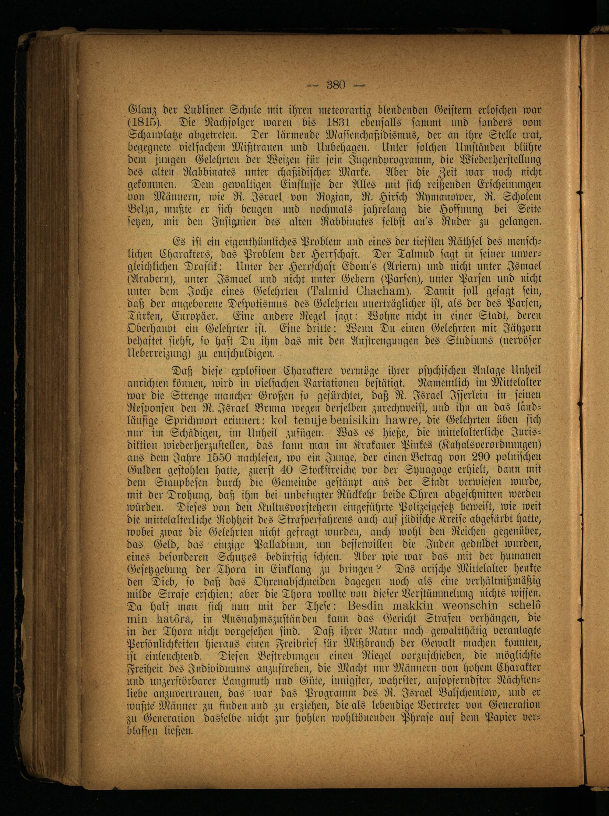 Daß diese explosiven Charaktere vermöge ihrer psychischen Anlage Unheil anrichten können, wird in vielfachen Variationen bestätigt. Namentlich im Mittelalter war die Strenge mancher Großen so gefürchtet, daß R. Israel Jsserlein in seinen Responsen den R. Israel Brnna wegen derselben zurechtweist, und ihn an das landläufige Sprichwort erinnert: i«st tenujklwulsilüu lrud'6, die Gelehrten üben sich nur im Schädigen, im Unheil zusügen. Was es hieße, die mittelalterliche Jurisdiktion wiederherznstellen, das kann man im Krakauer Pinkes (Kahalsverordnungen) ans dem Jahre 1550 Nachlesen, wo ein Junge, der einen Betrag von 290 polnischen Gulden gestohlen hatte, zuerst 40 Stockstrciche vor der Synagoge erhielt, dann mit dem Staupbesen durch die Gemeinde gestäupt aus der Stadt verwiesen wurde, mit der Drohung, daß ihm bei unbefugter Rückkehr beide Ohren abgeschnilten werden würden. Dieses von den Kultusvorstchern eingeführte Polizeigesetz beweist, wie weit die mittelalterliche Rohheit des Strafverfahrens auch auf jüdische Kreise abgefärbt hatte, wobei zwar die Gelehrten nicht gefragt wurden, auch wohl den Reichen gegenüber, das Geld, das einzige Palladium, um dessetwillen die Juden geduldet wurden, eines besonderen Schutzes bedürftig schien. Aber wie war das mit der humanen Gesetzgebung der Thora in Einklang zu bringen? Das arische Mittelalter henkte den Dieb, so daß das Ohrcnabschneiden dagegen noch als eine verhültnißmäßig milde Strafe erschien; aber die Thora wollte von dieser Verstümmelung nichts wissen. Da hals man sich nun mit der These: liebln inuiclüu WDOiweiüii sellelo nun iiuloim, in Ausnahmsznständen kann das Gericht Strafen verhängen, die in der Thora nicht vorgesehen sind. Daß ihrer Natur nach gewaltthntig veranlagte Persönlichkeiten hieraus einen Freibrief für Mißbrauch der Gewalt machen konnten, ist einleuchtend. Diesen Bestrebungen einen Riegel vvrzuschiebcn, die möglichste Freiheit des Individuums anznstreben, die Macht nur Männern von hohem Charakter nnd unzerstörbarer Langmuth und Güte, innigster, wahrster, aufopferndster Nächstenliebe anznvertrauen, das war das Programm des R. Israel Balschemtow, und er wußte Männer zu finden und zu erziehen, die als lebendige Vertreter von Generation zu Generation dasselbe nicht zur hohlen wohltönenden Phrase auf dem Papier verblassen ließen.