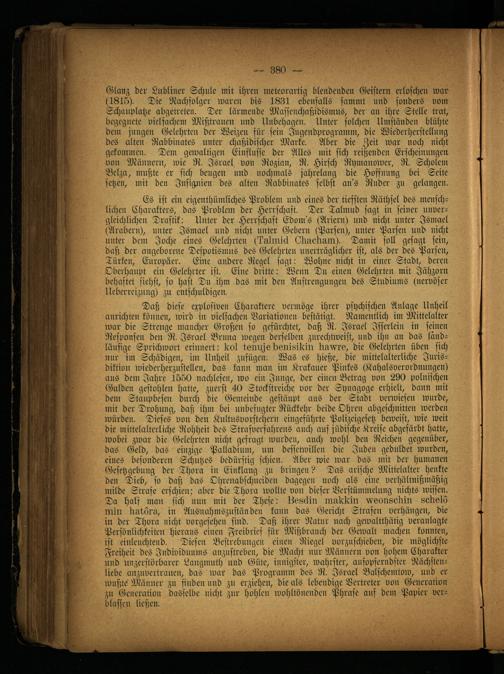 Glanz der Lubliner Schule mit ihren meteorartig blendenden Geistern erloschen war (1815). Die Nachfolger waren bis 1831 ebenfalls sammt und sonders vom Schauplätze abgetreten. Der lärmende Massenchaßidismus, der an ihre Stelle trat, begegnete vielfachem Mißtrauen nnd Unbehagen. Unter solchen Umständen blühte dem jungen Gelehrten der Weizen für sein Jugendprogramm, die Wiederherstellung des alten Rabbinates unter chaßidischer Marke. Aber die Zeit war noch nicht gekommen. Dem gewaltigen Einflüsse der Alles mit sich reißenden Erscheinungen von Männern, wie R. Israel, von Rozian, R. Hirsch Rymanower, R. Scholem Belza, mußte er sich beugen nnd nochmals jahrelang die Hoffnung bei Seite setzen, mit den Insignien des alten Rabbinates selbst an's Ruder zu gelangen.