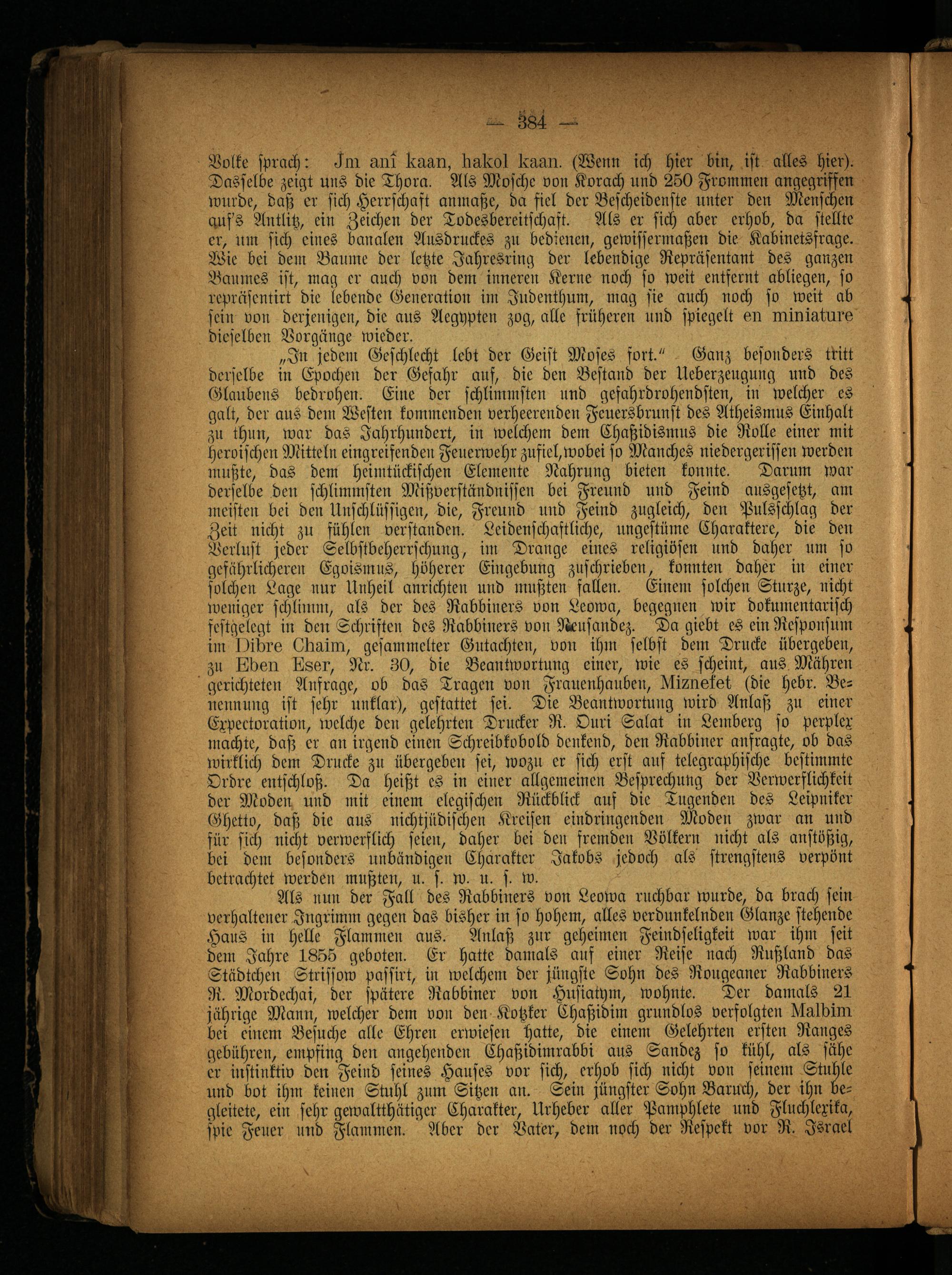 „In jedem Geschlecht lebt der Geist Moses fort." Ganz besonders tritt derselbe in Epochen der Gefahr auf, die den Bestand der Ueberzeugung und des Glaubens bedrohen. Eine der schlimmsten und gefahrdrohendsten, in welcher es galt, der aus dem Westen kommenden verheerenden Feuersbrunst des Atheismus Einhalt zu thun, war das Jahrhundert, in welchem dem Chaßidismus die Rolle einer mit heroischen Mitteln eingreifenden Feuerwehr zufiel, wobei so Manches niedergerissen werden mußte, das dem heimtückischen Elemente Nahrung bieten konnte. Darum war derselbe den schlimmsten Mißverständnissen bei Freund und Feind ausgesetzt, am meisten bei den Unschlüssigen, die, Freund und Feind zugleich, den Pulsschlag der Zeit nicht zu fühlen verstanden. Leidenschaftliche, ungestüme Charaktere, die den Verlust jeder Selbstbeherrschung, im Drange eines religiösen und daher um so gefährlicheren Egoismus, höherer Eingebung zuschrieben, konnten daher in einer solchen Lage nur Unheil anrichten und mußten fallen. Einem solchen Sturze, nicht weniger schlimm, als der des Rabbiners von Leowa, begegnen wir dokumentarisch sestgelegt in den Schriften des Rabbiners von Neusandez. Da giebt es ein Responsum im Diürs 6Uuim, gesammelter Gutachten, von ihm selbst dem Drucke übergeben, zu stibow llisor, Nr. llO, die Beantwortung einer, wie es scheint, aus Mähren gerichteten Anfrage, ob das Traget! von Frauenhanben, Mrmet'et (die hebr. Benennung ist sehr unklar), gestattet sei. Die Beantwortung wird Anlaß zu einer Expectoration, welche den gelehrten Drucker R. Ouri Salat in Lemberg so perplex inachte, daß er an irgend einen Schreibkobold denkend, den Rabbiner anfragte, ob das wirklich dem Drucke zu übergeben sei, wozu er sich erst ans telegraphische bestimmte Ordre entschloß. Da heißt es in einer allgemeinen Besprechung der Verwerflichkeit der Moden und mit einem elegischen Rückblick auf die Tugenden des Leipniker Ghetto, daß die aus uichtjndischen Kreisen eindringenden Moden zwar an und für sich nicht verwerflich seien, daher bei den fremden Völkern nicht als anstößig, bei dem besonders unbändigen Charakter Jakobs jedoch als strengstens verpönt betrachtet werden mußten, u. s. w. n. s. w.