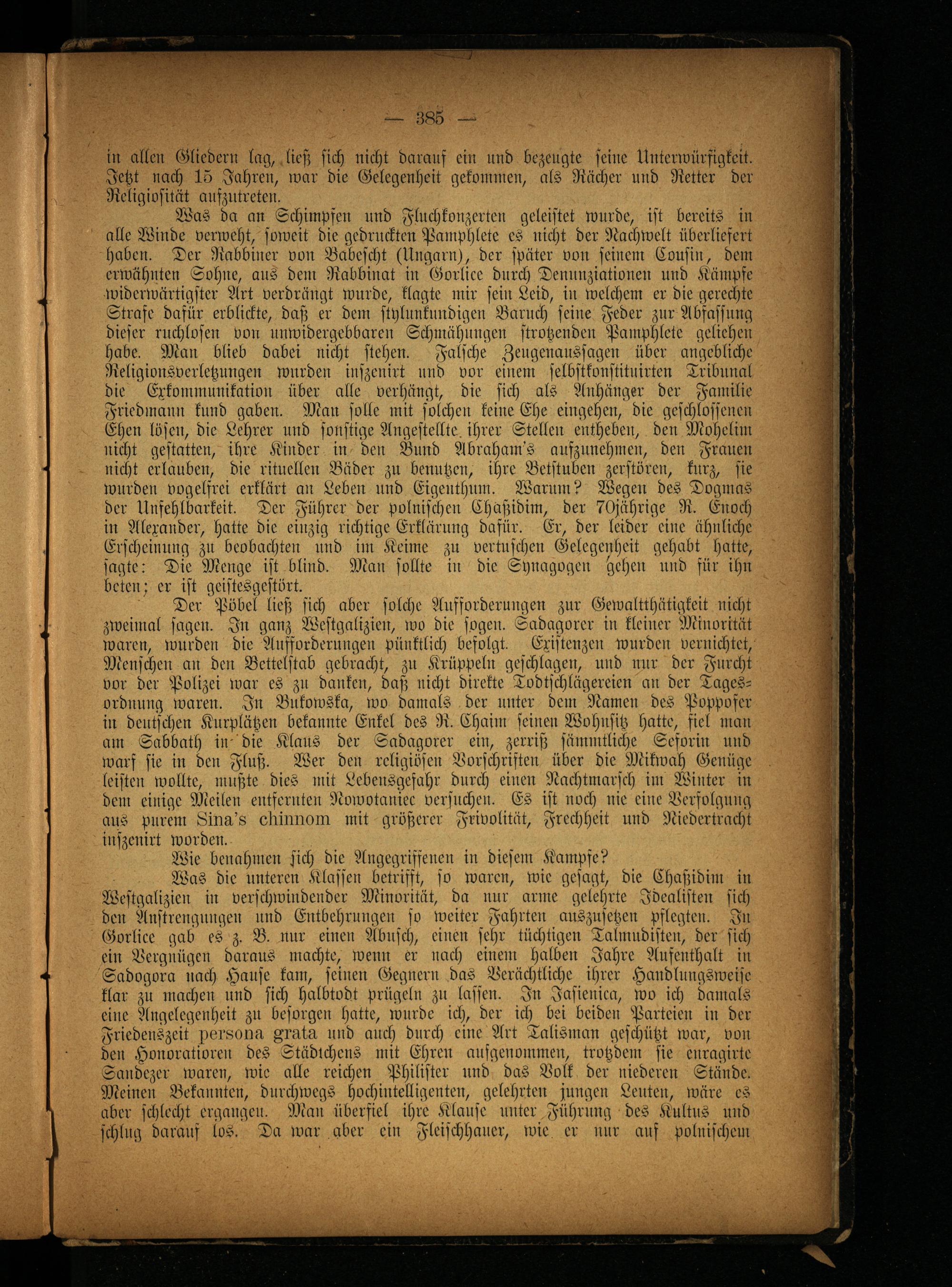 Was die unteren Klassen betrifft, so waren, wie gesagt, die Chaßidim in Westgalizicn in verschwindender Minorität, da nur arme gelehrte Idealisten sich den Anstrengungen nnd Entbehrungen so weiter Fahrten auszusetzen pflegten. In Gorlice gab es z. B. nur einen Äbnsch, einen sehr tüchtigen Talmndisten, der sich ein Vergnügen daraus machte, weuu er nach einem halben Jahre Aufenthalt in Sadogora nach Hause kam, seinen Gegnern das Verächtliche ihrer Handlungsweise klar zu machen und sich halbtodt Prügeln zu lassen. In Jasienica, wo ich damals eine Angelegenheit zu besorgen hatte, wurde ich, der ich bei beiden Parteien in der Friedenszeit pei'Kcmu Zrulu nnd auch durch eine Art Talisman geschützt war, von den Honoratioren des Städtchens mit Ehren ausgenommen, trotzdem sie cnragirte Sandezer waren, wie alle reichen Philister und das Volk der niederen Stünde. Meinen Bekannten, durchwegs hochiutelligenten, gelehrten jungen Leuten, wäre cs aber schlecht ergangen. Man überfiel ihre Klause unter Führung des Kultus nnd schlug daraus los. Da war aber ein Fleischhauer, wie er nur ans polnischem