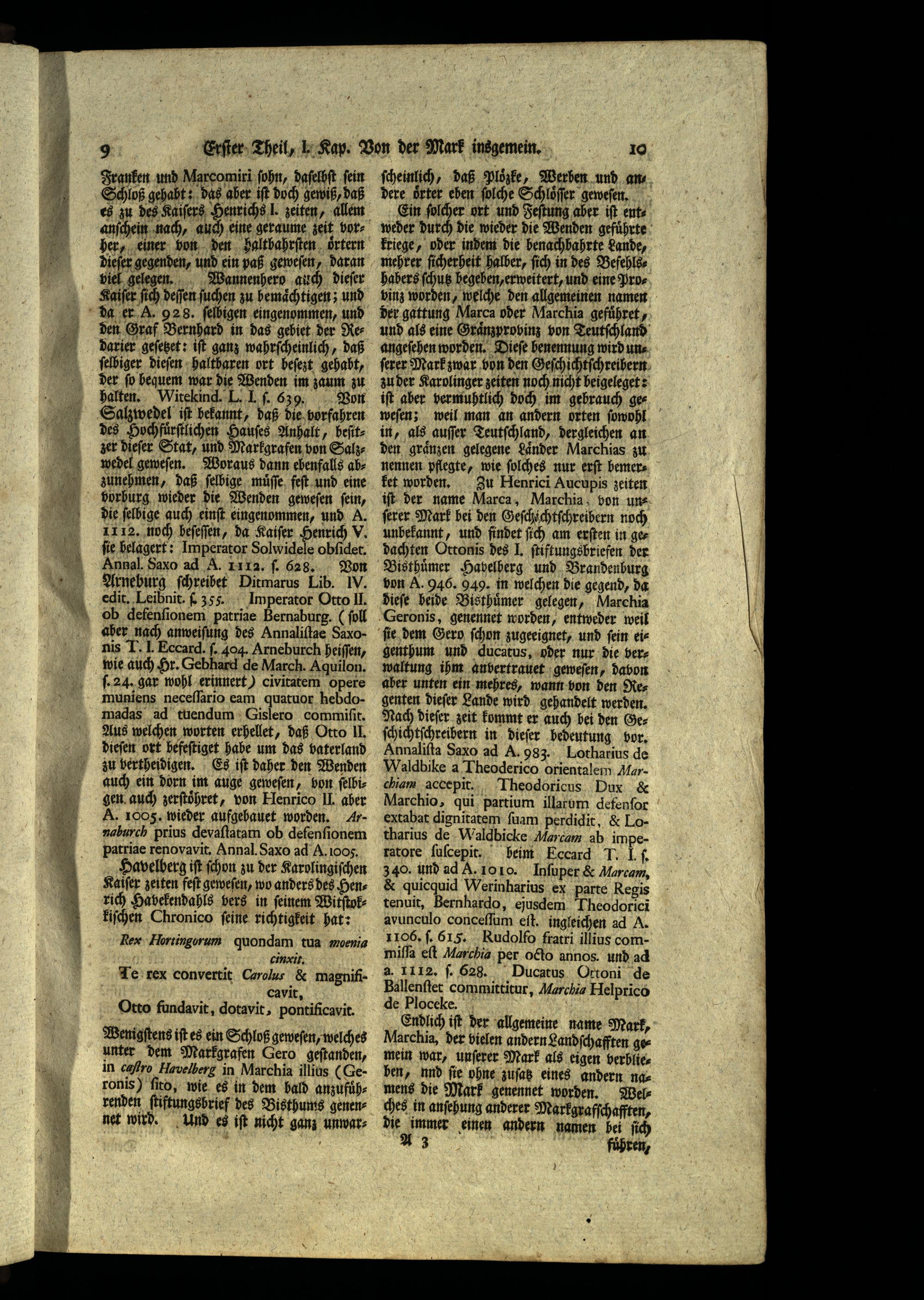 Ein ſolcher ort und Feſtung aber iſt entweder durch die wieder die Wenden geführte: kriege, oder indem die henachbahrte Lande, mehrer ſicherheit halber, ſich in des Befehlshabers ſchutz begeben, erweitert, und eine Pros vinz worden, welche den allgemeinen namen der gattung Marca oder archia gefuͤhret, und als eine Graͤnzprovinz von Teutſchland angeſehen worden. Dieſe benennung wird unſerer Mark zwar bon den Geſchichtſchreibern zu der Karolinger zeiten noch nicht beigeleget: iſt aber vermuhtlich doch im gebrauch ger. weſen; weil man an andern orten ſowohl in, als auſſer Teutſchland, dergleichen an den graͤnzen gelegene Laͤnder Marchias zu nennen pflegte, wie ſolches nur erſt bemerket worden. Zu Henrici Aucupis zeiten iſt der name Marca, Marchia von unſerer Mark bei den Geſchichtſchreibern noch unbekannt, und findet ſich am erſten in ger dachten Ottonis des J. ſtiftungsbriefen der Bisthuͤmer Habelherg und Brandenburg bon A. 946. 949. in welchen die gegend, da dieſe beide Bisthuͤmer gelegen, Marchia Geronis, genennet worden, entweder weil ſte dem Gero ſchon zugeeignet, und fein eis genthum und ducatus, oder nur die Der waltung ihm anvertrauet geweſen, dabon aher unten ein mehres, wann hon den Regenten dieſer Lande wird gehandelt werden. Nach dieſer zeit kommt er auch bei den Geſchichtſchreibern in dieſer bedeutung vor. Annaliſta Saxo ad A. 983... Lotharius de Waldbike a Theoderico orientalern Marchiam accepit. Theodoricus Dux& Marchio, qui partium illatum defenſor extabat dignitatem ſuam perdidit,& Lotharius de MWaldbicke Marcam ab imperatore ſuſcepit, beim Eecard J. 6. ſ. 340. und ad. 10109. Inſuper& Marcam, & quicquid Moerinharius ey parte Regis tenuit, Bernhardo, ejusdem Theodorici avunculo conceſſum eſt. ingleichen ad A. 1106. ſ. 615. Kudolfo fratri illius commiſſa eſt Marcha per octo annos. und ad a. 1112. ſ. 6288. Ducatus Ortoni de Ballenſtet committitur, Marchis Helprico de Ploceke.