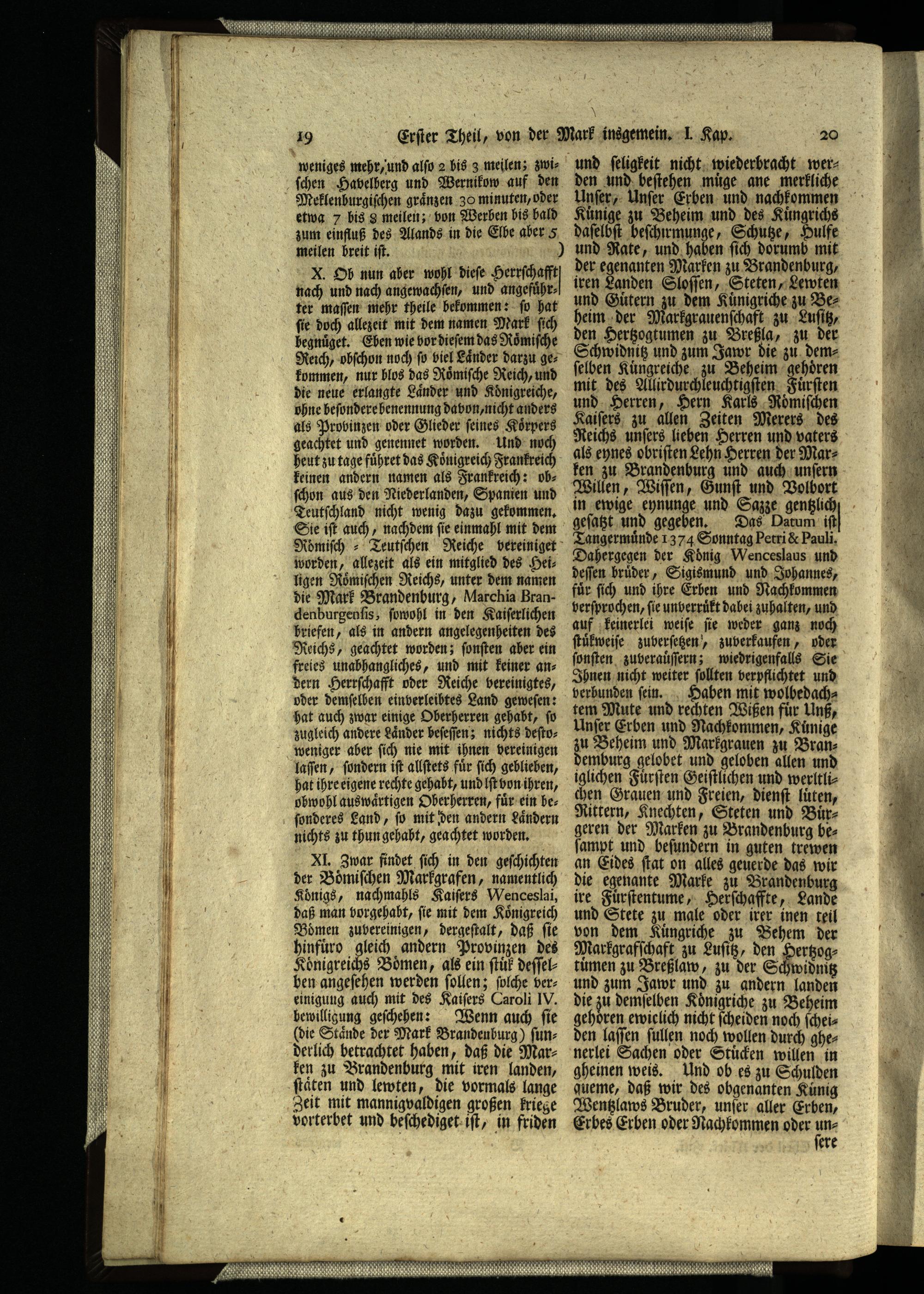 XI. Zwar ſindet ſich in den geſchichten der Boͤmiſchen Markgrafen, namentlich Königs, nachmahls Kaiſers Wenceslai, daß man vorgehabht, fie mit dem Koͤnigreich Boͤmen zuvereinigen, dergeſtalt, daß fie hinfuͤro gleich andern Provinzen des Königreichs Boͤmen, als ein ſtuͤk deſſelben angeſehen werden ſollen; ſolche ver: einigung auch mit des Kaiſers Caroli IV. bewilligung geſchehen: Wenn auch fie (die Stände der Mark Brandenburg) ſunderlich betrachtet haben, daß die Marken zu Brandenburg mit iren landen, ſtaͤten und lewten, die vormals lange Zeit mit mannigvaldigen großen kriege vorterbet und beſchediget iſt, in friden