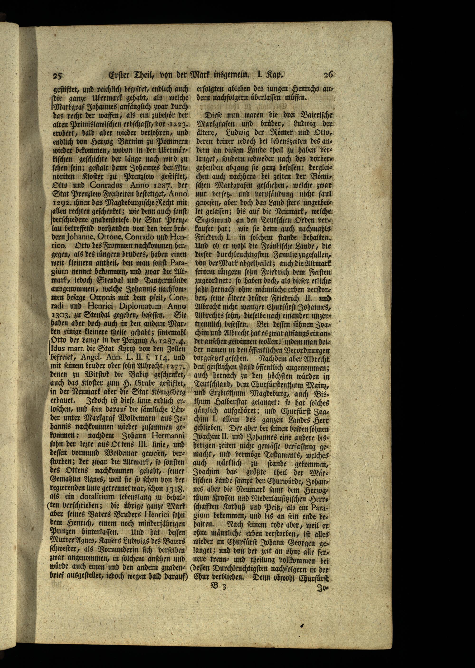 Dieſe nun waren die drei Baieriſche Markgrafen und hruͤder, Ludwig der aͤltere, Ludwig der Roͤmer und Otto, deren keiner jedoch bei lebenszeiten des andern an dieſem Lande theil zu haben verlanget, ſondern iedweder nach des vorhergehenden abgang fie ganz heſeſſen: dergleichen auch nachhero hei zeiten der Boͤmiſchen Markgrafen geſchehen, welche zwar mit verſetz⸗ und verpfaͤndung nicht faul geweſen, aber doch das Land ſtets ungetheilet gelaſſen; bis auf die Neumark, welche Sigismund an den Teutſchen Orden verkaufet hat; wie ſie denn auch nachmahls Friedrich L. in ſolchem ſtande behalten. Und oh er wohl die Fraͤnkiſche Lande, die dieſer durchleuchtigſten Familie zugefallen, von der Mark ahgetheilet; auch die Altmark ſeinem iuͤngern ſohn Friedrich dem Feiſten zugeordnet: ſo haben doch, als dieſer etliche jahr hernach ohne maͤnnliche erben verſtorben, feine aͤltere hruͤder Friedrich Il. und Albrecht nicht weniger Churfuͤrſt Johannes, Albrechts ſohn, dieſelbe nach einander unzertrennlich beſeſſen. Bei deſſen ſoͤhnen Joachim und Albrecht hat es zwar anfangs ein ander anſehen gewinnen wollen: indem man heider namen in den oͤffentlichen Verordnungen borgeſetzet geſehen. Nachdem aber Albrecht den geiſtlichen ſtand öffentlich angenommen; auch hernach zu den hoͤchſten würden in Teutſchland, dem Churfuͤrſtenthum Mainz, und Erzbisthum Magdeburg, auch Bis— thum Halherſtat gelanget: ſo hat ſolches gaͤnzlich aufgehöͤret; und Churfuͤrſt Joa—chim 1. allein des ganzen Landes Herr geblieben. Der aber bei ſeinen beiden ſoͤhnen JIvachim II. und Johannes eine andere bis: herigen zeiten nicht gemaͤſſe verfaſſung gemacht, und vermöge Teſtaments, welches auch wuͤrklich zu ſtande gekommen, Joachim das größte theil der März kiſchen Lande ſampt der Churwurde, Johannes aher die Neumark ſamt dem Herzogthum Kroſſen und Niederlauſitziſchen Herrſchafften Kothuß und Peitz, als ein Paragium bekommen, und his an ſein ende bes halten. Nach ſeinem tode aber, weil er ohne maͤnnliche erben verſtorhen, if alles wieder an Churfuͤrſt Johann Georgen gelanget; und von der zeit an ohne alle fernere trenn⸗ und theilung vollkommen bei (deſſen Durchleuchtigſten nachfolgern in der