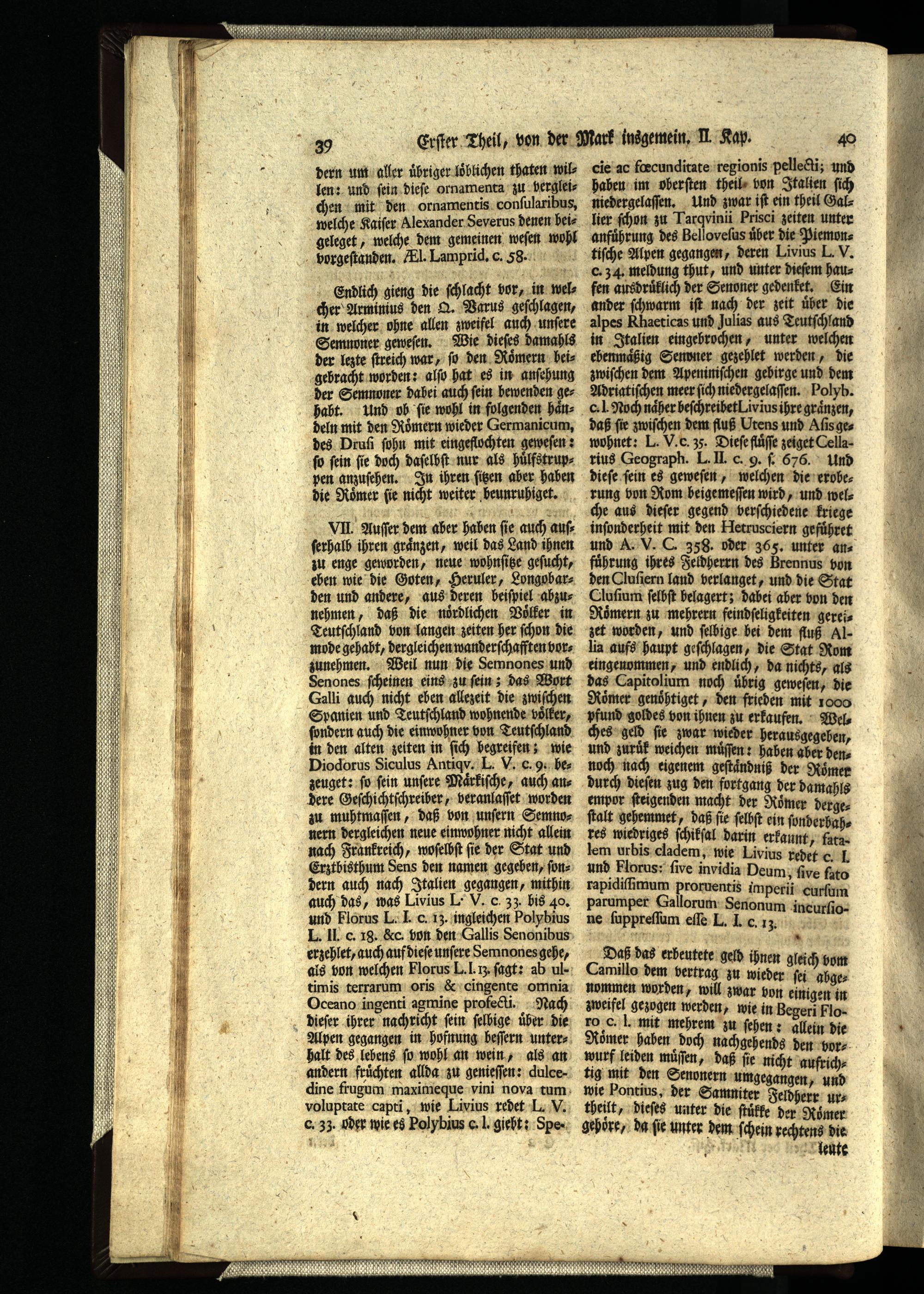VII. Auſſer dem aber haben ſie auch auſſerhalb ihren graͤnzen, weil das Land ihnen zu enge geworden, neue wohnſitze geſucht, eben wie die Goten, Heruler, Longobarden und andere, aus deren beiſpiel abzunehmen, daß die nördlichen. Völker. in Teutſchland von langen zeiten her ſchon die mode gehabt, dergleichen wanderſchafften vorzunehmen. Weil nun die Semnones und Senones ſcheinen eins zu ſein; das Wort Galli auch nicht eben allezeit die zwiſchen Spanien und Teutſchland wohnende voller, ſondern auch die einwohner von Teutſchland in den alten zeiten in ſich begreifen; wie Diodorus Siculus Antiq. L. V. c. 9. be: zeuget: ſo ſein unſere Maͤrkiſche, auch andere Geſchichtſchreiber, veranlaſſet worden zu muhtmaſſen, daß von unſern Semnonern dergleichen neue einwohner nicht allein nach Frankreich, woſelbſt ſie der Stat und Erzthisthum Sens den namen gegeben, ſondern auch nach Italien gegangen, mithin auch das, was Livius L. V. c. 33 bis 40. und Florus L. I. c. 13. ingleichen Polybius L. IL. c. 18.&c. von den Gallis Senonibus erzehlet, auch auf dieſe unſere Semnones gehe, als von welchen Florus LI. iz. ſagt: ab ultimis terrarum oris& cingente omnia Oceano ingenti agmine prolecti. Nach