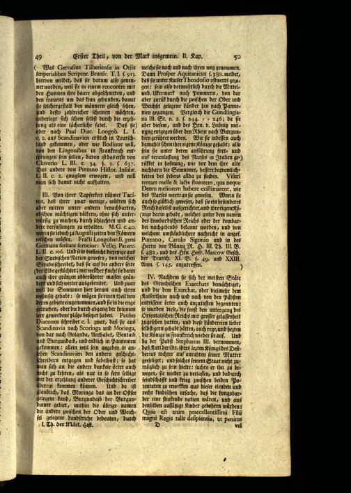 Pſrungen fein ſollen, davon iſt das erſte von auf veranlaſſung des Narſes in Italien ge) Cluverio L. III. e. 34.$. 5. ſ. 637. ruͤkket in hofnung, wie vor dem ihre alte Das andere von Puteano Hiſtor. Inſuhr. nachbarn die Semnoner, beſſere beqvemlichLI cc. 2. gnugſam erwogen, und will keiten des Lebens allda zu finden. PViſuri man ſich damit nicht aufhalten. terram melle& lacte fluentem, qua neque . Deum meliorem habere exiſtimarent, wie III. Von ihrer Tapferkeit ruͤhmet Taci. des Narſes worte an fie geweſen. Worin fie rns, daß ihrer zwar wenige, wuͤßten ſich auch ſu gluͤklich geweſen, daß ſie ein beſonderes acaber mitten unter andern benachbarten, Reich daſelbſt aufgerichtet, und ihre eigene KoͤbPhbſchon mächtigen voͤlkern, ohne ſich unter-(nige darin gehabt, welches unter dem namen wuͤrfig zu machen, durch ſchlachten und an- des Lombardiſchen Reichs oder der Lombardere verfaſſungen zu erhalten. M. G. c. 40. dei nachgehends bekannt worden, und bon wyrin ſie iedoch zu Auguſtizeiten den Röͤmern welchem umſtaͤndlichere nachricht in angef. ichen muͤſſen. Fracti Longobardi, gens Puteano, Carolo Sigonio und in des