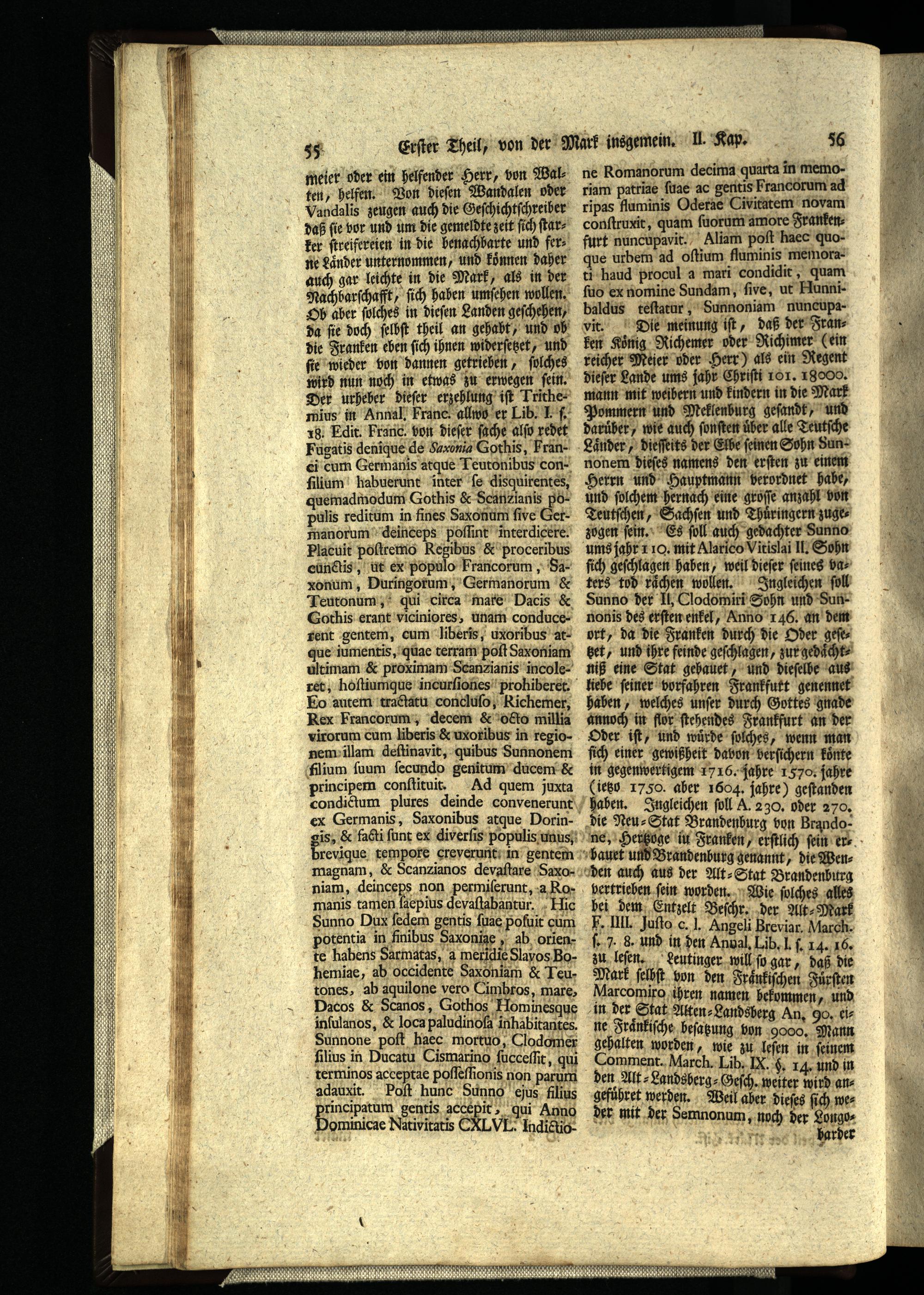 ſich geſchlagen haben, weil dieſer feines ha ters tod rächen wollen. Ingleichen ſoll Sunno der Il, Clodomiri Sohn und Sunnonis des erſten enkel, Anno 146. an dem ort, da die Franken durch die Oder geſetet, und ihre feinde geſchlagen, zur gehaͤchtniß eine Stat gehauet. und dieſelbe aus liebe ſeiner vorfahren Frankfutt genennet haben, welches unſer durch Gottes gnade annoch in flor ſtehendes Frankfurt an der Oder iſt, und würde ſolches, wenn man ſich einer gewißheit dabon berſichern koͤnte in gegenwertigem 1716. jahre 1570. jahre lietzo 1750. aber 1604. jahre) geſtanden