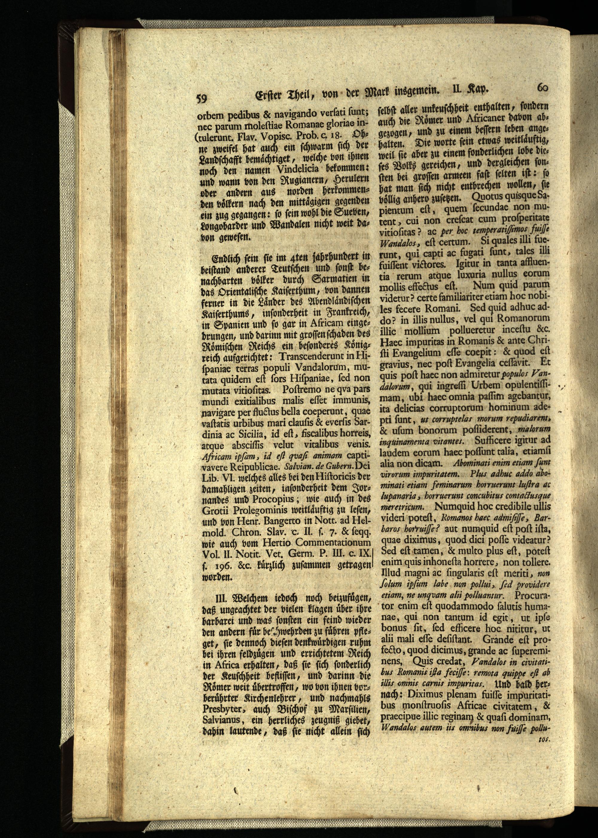 Ill. Welchem iedoch noch beizufügen, daß ungeachtet der vielen klagen über ihre harharei und was ſonſten ein feind wieder den andern für he hwehrden zu führen pfleget, fie dennoch dieſen denkwuͤrdigen ruhm bei ihren feldzuͤgen und errichtetem Rei in Africa erhalten, daß ſie ſich. der Keuſchheit befliſſen, und darinn die Roͤmer weit uͤbertroffen, wo von ihnen vorberuͤhrter Kirchenlehrer, und nachmahls Presbyter, auch Biſchof zu Marſilien, Salvianus, ein herrliches zeugniß giebet, dahin lautende, daß ſie nicht allein ſich