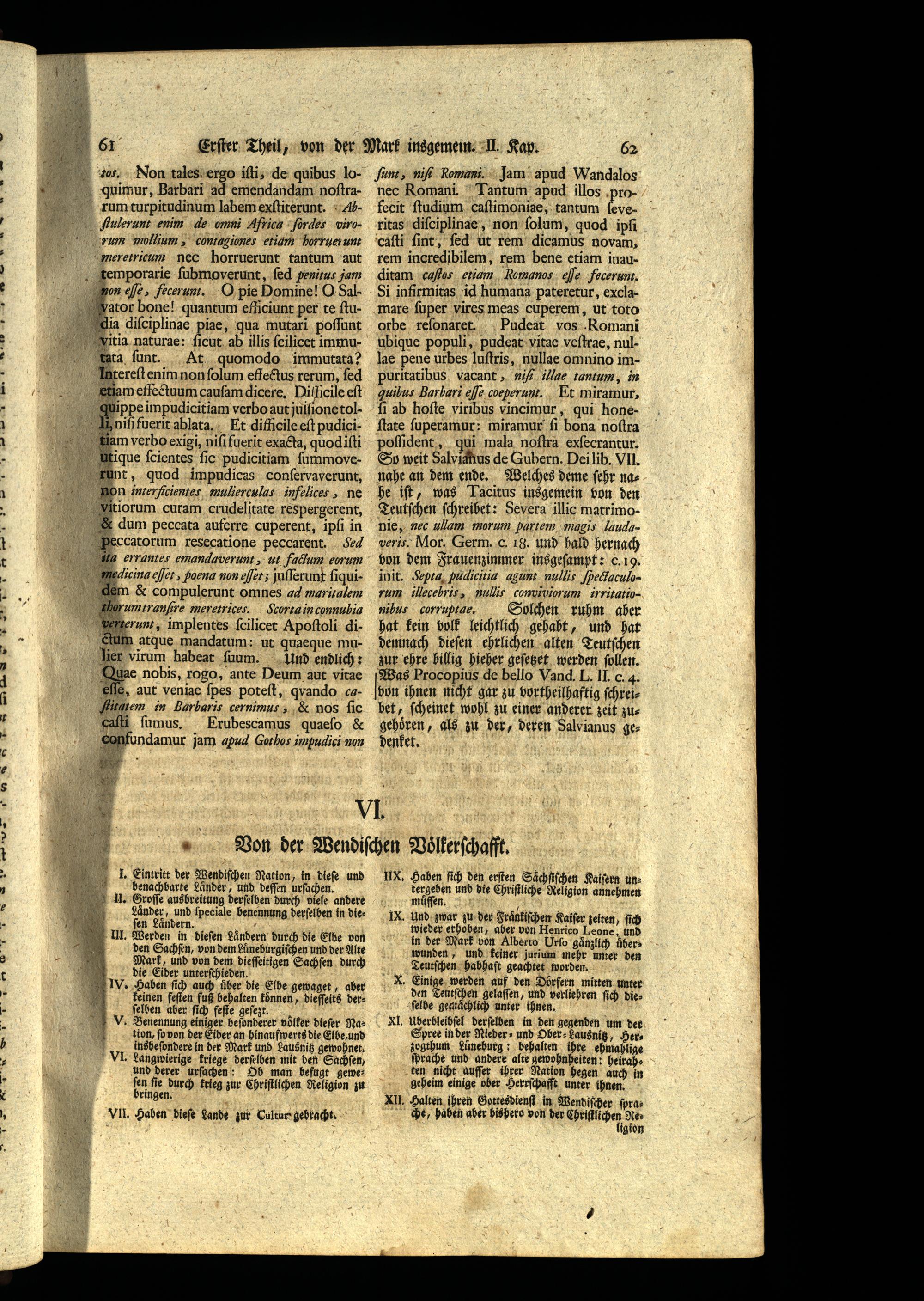 EN keinen feſten fuß behalten konnen, dieſſeits der| ſelben aber ſich feſte geſezi. V. Benennung einiger beſonderer volker dieſer Na4 tion, fovon der Eider an hinaufwerts die Elbe, und insbeſondere in der Mark und Lausnitz gewohnet. VI. Langwierige kriege derſelben mit den Sachſen, und derer urſachen: Ob man befugt gewe. ſie durch krieg zur Chriſtlichen Religion zu ringen.