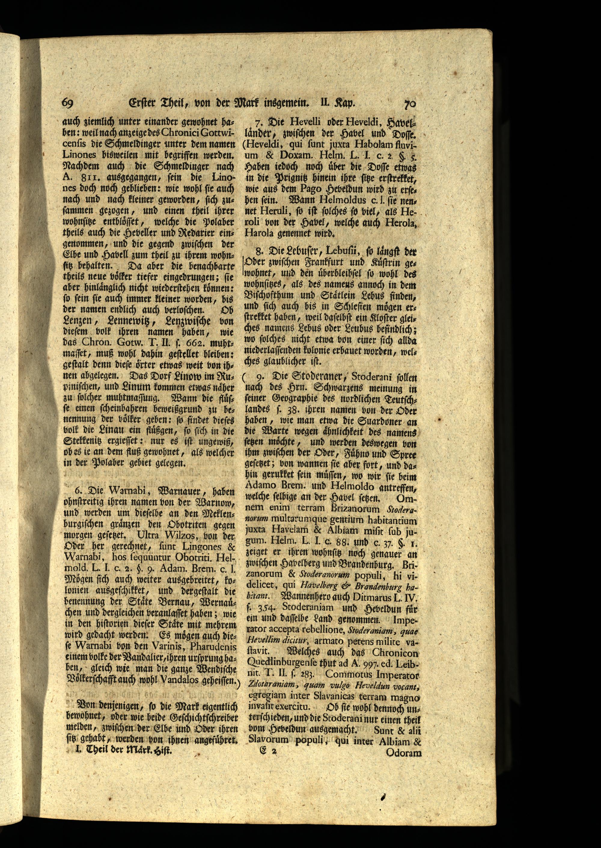 9. Die Stoderaner, Stoderanĩ ſollen nach des Hrn. Schwarzens meinung in feiner Geographie des nördlichen Teutſchlandes ſ. 38. ihren namen von der Oder haben, wie man etwa die Suardoner an die Warte wegen aͤhnlichkeit des namens ſetzen möchte, und werden deswegen von ihm zwiſchen der Oder, Fuͤhno und Spree geſetzet; von wannen fie aher fort, und das hin gerukket fein müuͤſſen, wo wir fie beim Adamo Brem. und Helmoldo antreffen, welche ſelbige an der Havel ſetzen. Omnem enim terram Brizanorum Grodergnorum multagrumque gentium habitantium juxta Havelam& Albiam miſit ſub jugum. Helm. L. J. C. 88. und C. 3, S. 1. zeiget er ihren wohnſitz noch genauer an zwiſchen Havelberg und Brandenhurg. Brizanorum& Gzoderanorum populi, hi videlicet, qui Havelberg& Brandenburg has bitant. Wannenhero auch Ditmarus L. IV. ſ. 3564. Stoderaniam und Hebeldun für ein und daſſelbe Land genommen. Imperator accepta rebellione, Stoderaniam', quae Hevellim dicitur, armato petens milite vaſtavit. Welches auch das Chronicon Quedlinburgenſe thut ad A. 99% ed. Leibnit. I. Il. ſ 23; Commotus Imperator Zdotaraniam, quam vulgo Heveldun vocant, egregiam inter Slavanicas terram magno invaſit exercitu. O hb ſie wohl dennoch unterſchieden, und die Stoderani nur einen theil bom Heveldun ausgemacht. Sunt& ali Slavorum populi, qui inter Albiam& 84 Odoram