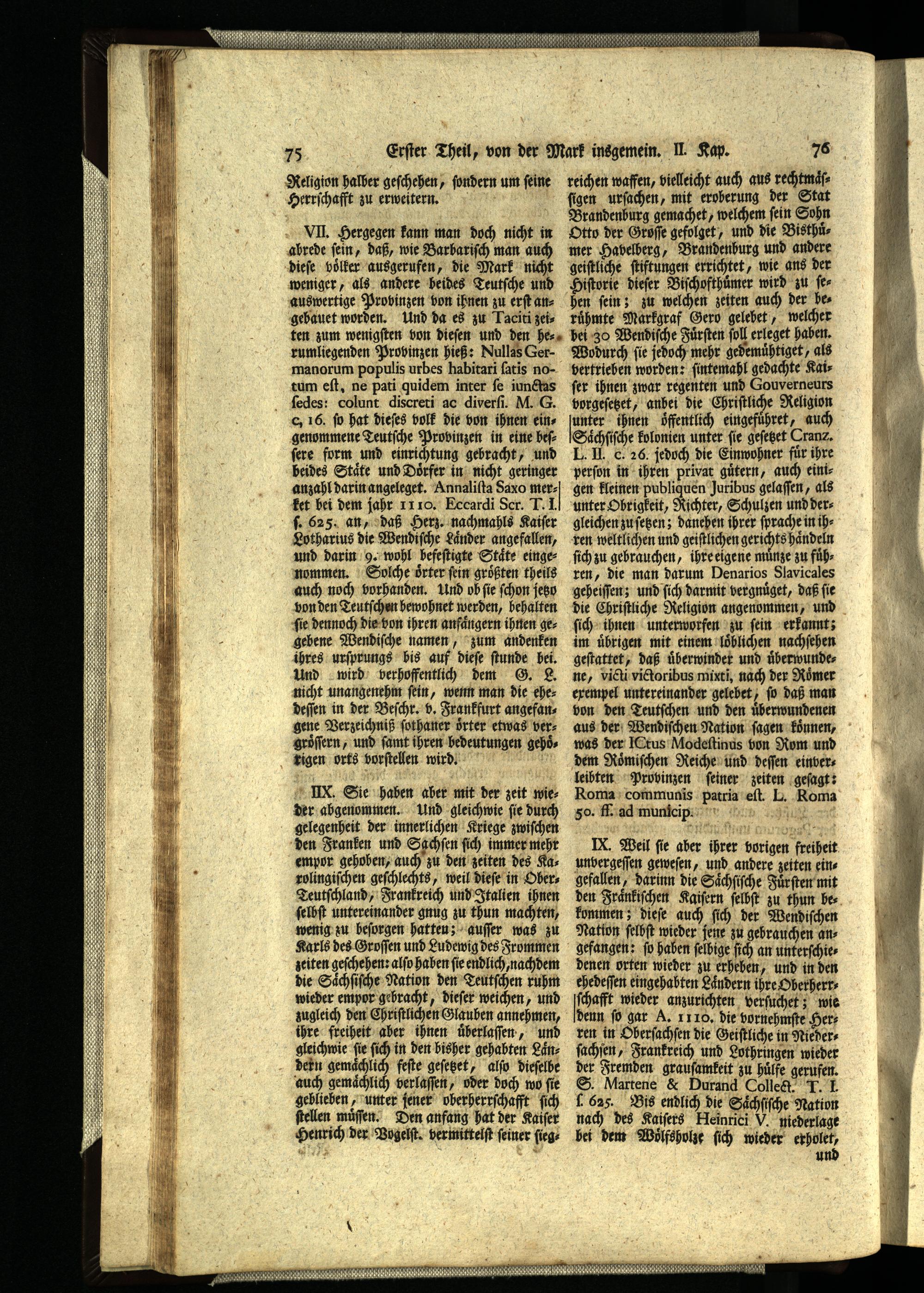 VII. Hergegen kann man doch nicht in abrede ſein, daß, wie Barbariſch man auch dieſe voͤlker ausgerufen, die Mark nicht weniger, als andere beides Teutſche und auswertige Provinzen von ihnen zu erſt angebauet worden. Und da es zu Taciti zeiten zum wenigſten von dieſen und den herumliegenden Provinzen hieß: Nullas Germanorum populis urbes habitari ſatis notum eſt, ne pati quidem inter ſe iunctas ſedes: colunt discreti ac diverſi. M. G. c. 16. ſo hat dieſes volk die von ihnen eingenommene Teutſche Probinzen in eine beſſere form und einrichtung gebracht, und beides Staͤte und Doͤrfer in nicht geringer anzahl darin angeleget. Annaliſta Saxo merket bei dem jahr 1110. Eccardi Scr. L.. ſ. 625. an, daß Herz. nachmahls Kaiſer Lotharius die Wendiſche Laͤnder angefallen, und darin 9. wohl befeſtigte Staͤte einge: nommen. Solche oͤrter fein größten theils auch noch vorhanden. Und ob ſie ſchon jetz von den Teutſchen hewohnet werden, behalten ſie dennoch die bon ihren anfaͤngern ihnen gegebene Wendiſche namen, zum andenken ihres urſprungs his auf dieſe ſtunde bei. Und wird verhoffentlich dem G. E. nicht unangenehm ſein, wenn man die ehedeſſen in der Beſchr. v. Frankfurt angefangene Verzeichniß ſothaner oͤrter etwas vergroͤſſern, und ſamt ihren bedeutungen gehoͤ