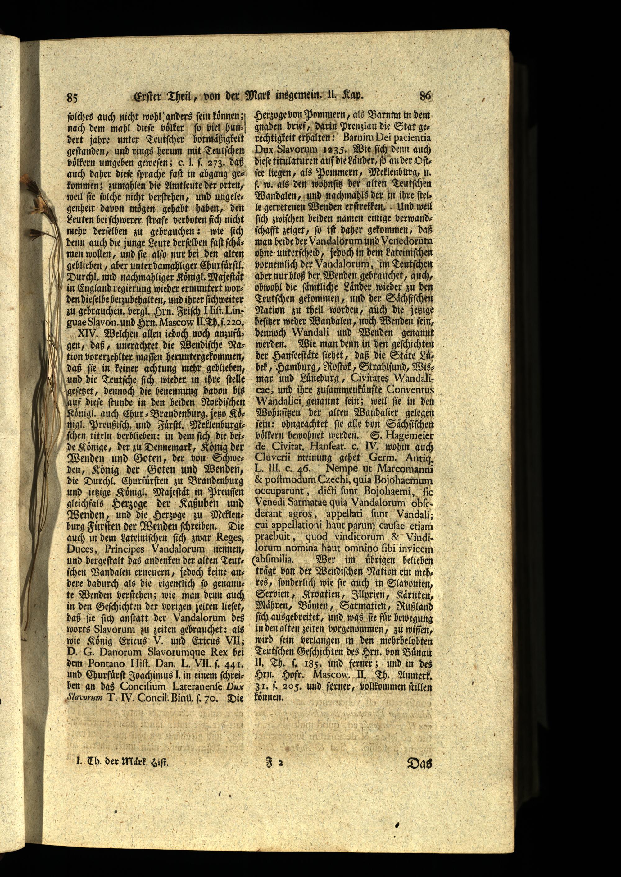 geblieben, aber unter damahliger Churfuͤrſtl. Durchl. nnd nachmahliger Koͤnigl. Majeſtaͤt in England regierung wieder ermuntert woren dieſelbe beizubehalten, und ihrer ſichweit er u gebrauchen. vergl. Hrn. Friſch Hiſt. Linguane Slavon. und Hrn. Mascow IITh. ſ 220, XIV. Weichen allen iedoch noch anzufuͤgen, daß, unerachtet die Wendiſche Nation vorerzehlter maſſen heruntergekommen, aß ſie in keiner achtung mehr geblieben, und die Teutſche ſich wieder in ihre ſtelle Ygeſetzet, dennoch die benennung davon bis | auf dieſe ſtunde in den beiden Nordiſchen Königl. auch Chur⸗Brandenburg, jetzt Koͤnigl. Preußiſch. und Fuͤrſtl. Meklenburgiſchen titeln verblieben: in dem ſich die heide Könige, der zu Dennemark, König der