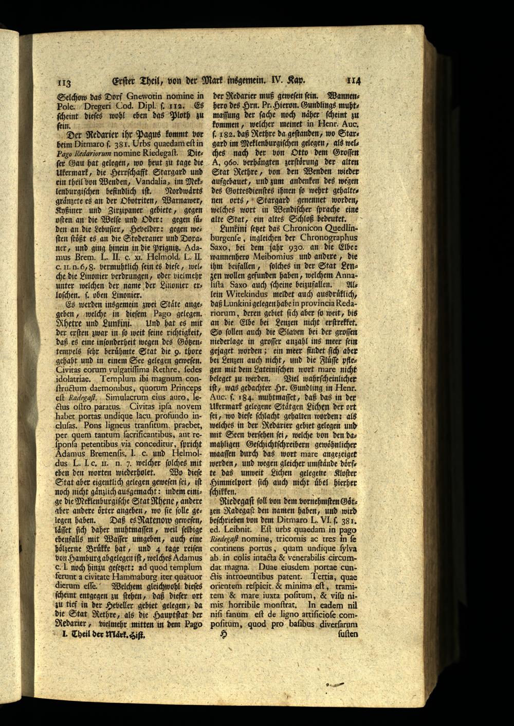 Rhetre und Lunkini. Und hat es mit der erſten zwar in ſo weit ſeine richtigkeit, daß es eine inſonderheit wegen des Gotzentempels ſehr beruͤhmte Stat die 9. thore gehaht und in einem See gelegen geweſen. Civitas eorum vulgatiſſima Rethre, ſedes idolatriae. Templum ibi magnum conſtructum daemonibus, quorum Princeps eſt Radegaſt. Simulacrum eius auro, leGus oſtro paratus. Civitas ipſa novem habet portas undique lacu profundo incluſas. Pons ligneus tranſitum, praebet, per quem tantum ſacrificantibus, aut reſponſa petentibus via conceditur, ſpricht Adamus Bremenſis. J. C. und Helmoldus L. Lc. 1. n. 7. welcher ſplches mit eben den worten wiederholet. Wo dieſe Stat aber eigentlich gelegen geweſen ſei, iſt noch nicht gaͤnzlich ausgemacht: indem einige die Meklenburgiſche Stat Rhene, andere aber andere oͤrter angeben, wo fie ſpolle gelegen haben. Daß es Ratenow geweſen, laͤſſet ſich daher muhtmaſſen, weil ſelbige ebenfalls mit Waſſer umgeben, auch eine hoͤlzerne Bruͤkke hat, und 4 tage reifen von Hamburg abgelegen iſt, welches Adamus C. L noch hinzu geſetzet: ad quod templum ferunt a civitate Hammaburg iter quatuor dierum eſſe. Welchem gleichwohl dieſes ſcheint entgegen zu ſtehen, daß dieſer ort zu tief in der Hebeller gebiet gelegen, da die Stat Rethre, als die Hauptſtat der Redarier, vielmehr mitten in dem Pago I. Theil der Maͤrk. Hiſt.