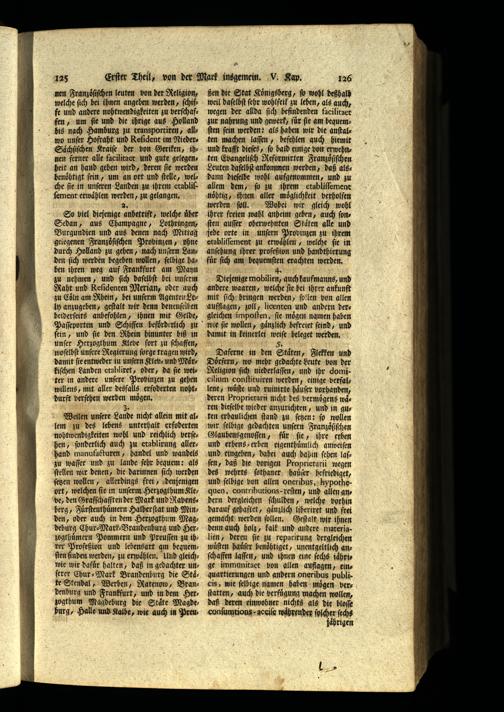 Weilen unſere Lande nicht allein mit allem zu des lebens unterhalt erfoderten nohtwendigkeiten wohl und reichlich verſehen, ſonderlich auch zu etablirung allerhand manufacturen, handel und wandels zu waſſer und zu lande ſehr bequem: als ſtellen wir denen, die darinnen ſich werden ſetzen wollen, allerdings frei, denjenigen ort, welchen ſie in unſerm Herzogthum Kleve, den Graſſchafften der Mark und Ravensberg, Fuͤrſtenthuͤmern Halberſtat und Minden, oder auch in dem Herzogthum Magdeburg Chur⸗Mark⸗Brandenhurg und Herzogthuͤmern Pommern und Preuſſen zu ihrer e er und lebensart am hequemſten ſinden werden, zu erwaͤhlen. Und gleichwie wir dafuͤr halten, daß in gedachter unſerer Chur⸗Mark Brandenburg die Staͤte Stendal, Werben, Ratenyw, Brandenburg und Frankfurt, und in dem Herzogthum Magdeburg die Staͤte MagdeBurg, Halle und Kalbe, wie auch in Preu