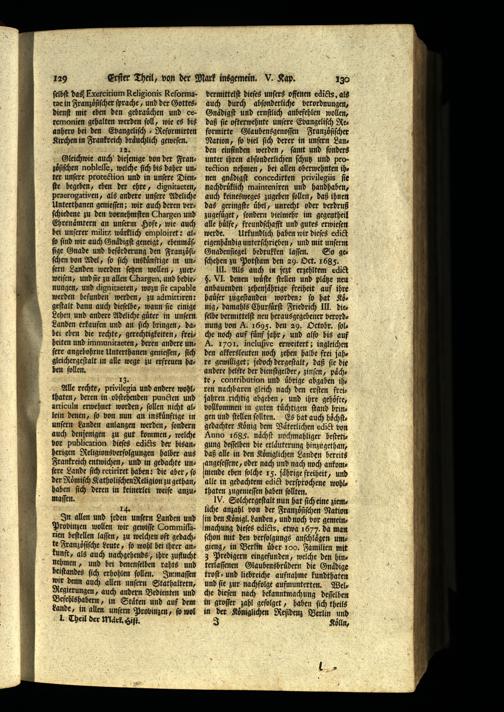 IV. Solchergeſtalt nun hat ſich eine ziemliche anzahl von der Franzoͤſiſchen Nation ö den Koͤnigl. Landen, und noch bor gemeinmachung dieſes edicts, etwa 1677. da man ſchon mit den verfolgungs anſchlaͤgen umgieng, in Berlin uͤber 100. Familien mit 3 Predigern eingefunden, welche den hinterlaſſenen Glaubensbruͤdern die Gnaͤdige troſt⸗ und liebreiche aufnahme kundthaten und ſie zur nachfolge aufmunterten. Welche dieſen nach bekanntmachung deſſelben in groſſer zahl gefolget, haben ſich theils in der Koͤniglichen Reſidenz Berlin und