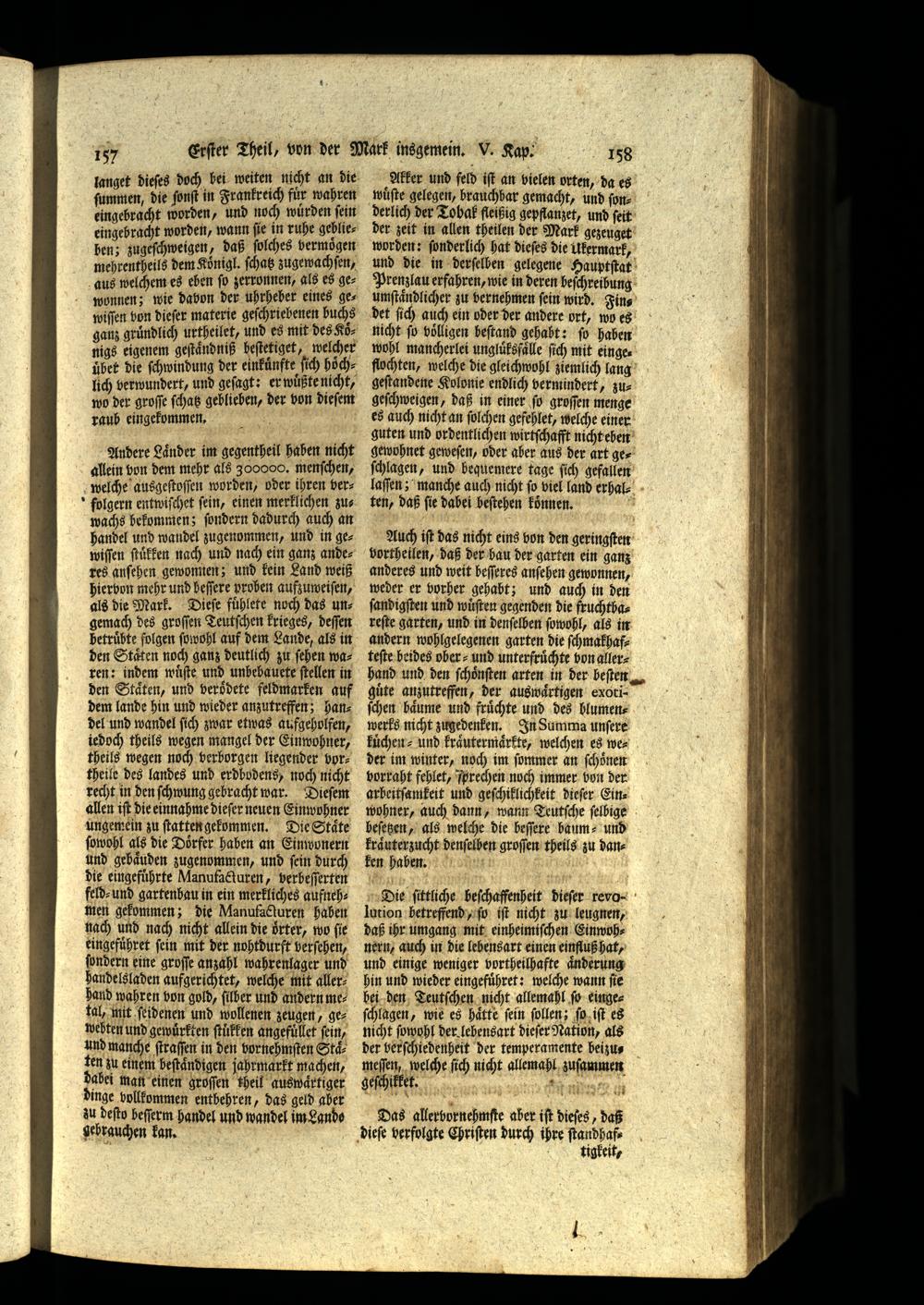 Andere Laͤnder im gegentheil haben nicht allein phon dem mehr als 300000. menſchen, welche ausgeſtoſſen worden, oder ihren verfolgern entwiſchet ſein, einen merklichen zuwachs bekommen; ſondern dadurch auch an handel und wandel zugenommen, und in gewiſſen ſtuͤkken nach und nach ein ganz anderes anſehen gewonnen; und kein Land weiß hiervon mehr und beſſere proben aufzuweiſen, als die Mark. Dieſe fuͤhlete noch das ungemach des groſſen Teutſchen krieges, deſſen betruͤbte folgen ſowohl auf dem Lande, als in den Staͤten noch ganz deutlich zu ſehen wa