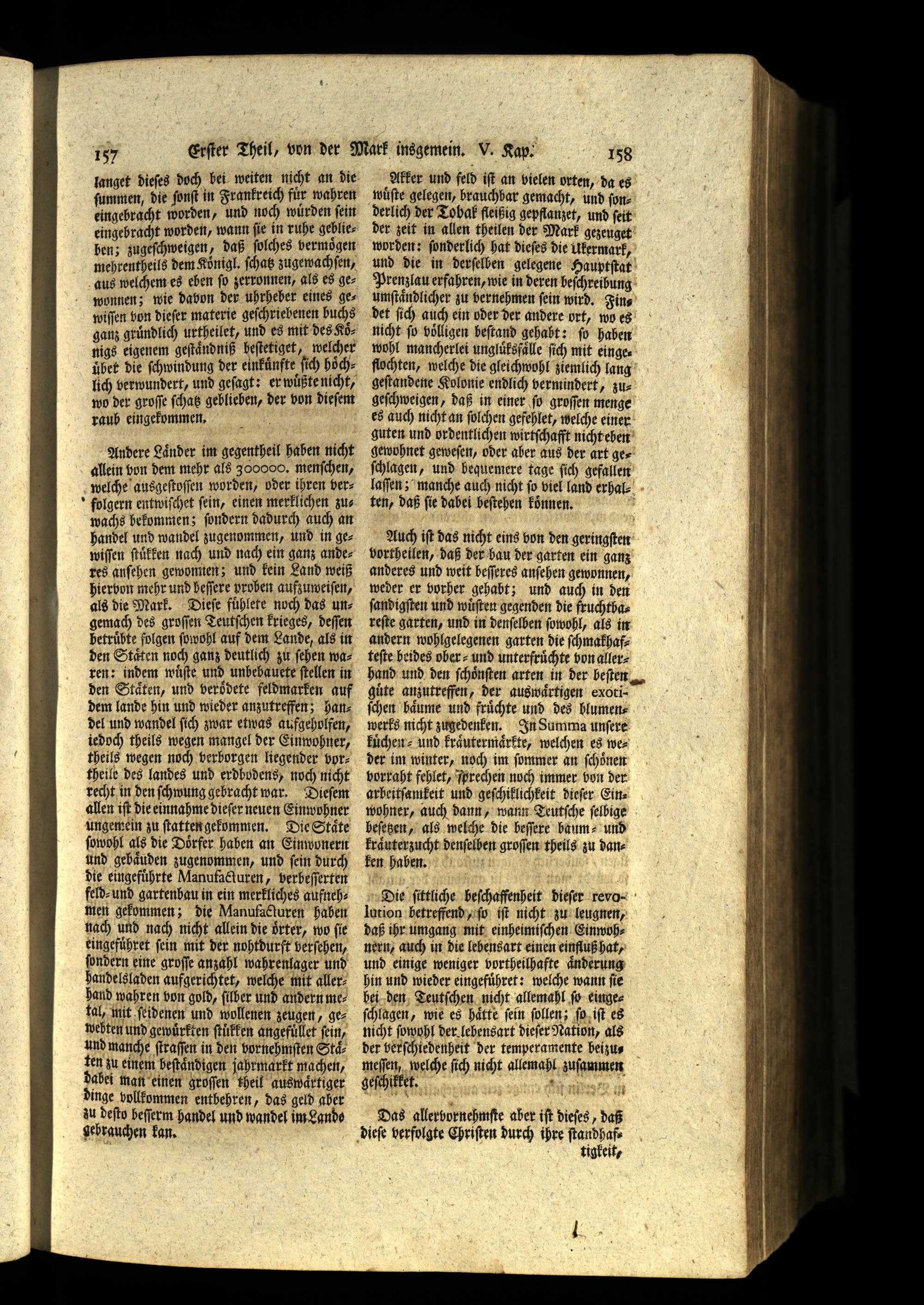 recht in den ſchwung gehracht war. Dieſem allen iſt die einnahme dieſer neuen Einwohner ungemein zu ſtatten gekommen. Die Staͤte ſowohl als die Dorfer haben an Einwonern und gebaͤuden zugenommen, und fein durch die eingeführte Manufacturen, verbeſſerten feld⸗ und gartenbau in ein merkliches aufnehmen gekommen; die Manufacturen haben nach und nach nicht allein die oͤrter, wo(ie eingefuͤhret fein mit der nohtdurft berſehen, ſondern eine groſſe anzahl wahrenlager und handelsladen aufgerichtet, welche mit allerhand wahren von gold,(ber und andern metal, mit ſeidenen und wollenen zeugen, gewebten und gewuͤrkten ſtuͤrken angefuͤllet fein, und manche ſtraſſen in den vornehmſten Staͤten zu einem beſtaͤndigen jahrmarkt machen, dabei man einen groſſen theil auswaͤrtiger dinge vollkommen enthehren, das geld aber zu deſto beſſerm handel und wandel im Lando gebrauchen kan.